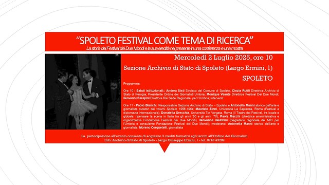 Nell'ambito della 68^ edizione del Festival dei Due Mondi, mercoledì 2 luglio 2025, alle ore 10.00, nella sede della Sezione di Archivio di Stato di Spoleto, si tiene l'inaugurazione di una mostra e la conferenza Nelle pagine della cultura: il Festival dei Due Mondi, la città e il mondo dell’informazione, che quest’anno approfondisce un aspetto particolare: Spoleto Festival come tema di ricerca, per offrire un quadro dei filoni di ricerca attivati in questi ultimi anni sull’argomento da alcune università italiane, grazie anche agli studi promossi e ai volumi pubblicati dalla stessa Sezione di Archivio di Stato di Spoleto, parallelamente all’esplorazione e riordino di materiali e fondi archivistici conservati in seno alle istituzioni cittadine.