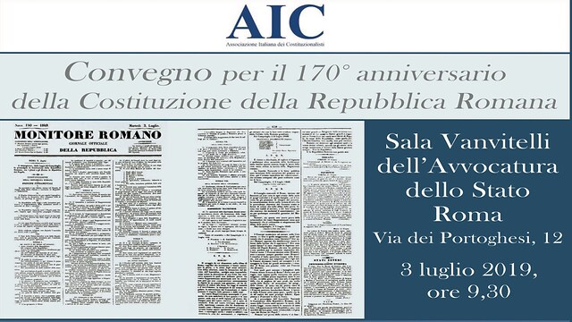 Il 3 luglio p.v. alle ore 9:30, presso la Sala Vanvitelli dell’Avvocatura dello Stato, si terrà il convegno per il 170° anniversario della Costituzione della Repubblica Romana. L'evento è organizzato dall’Associazione Italiana Costituzionalisti.