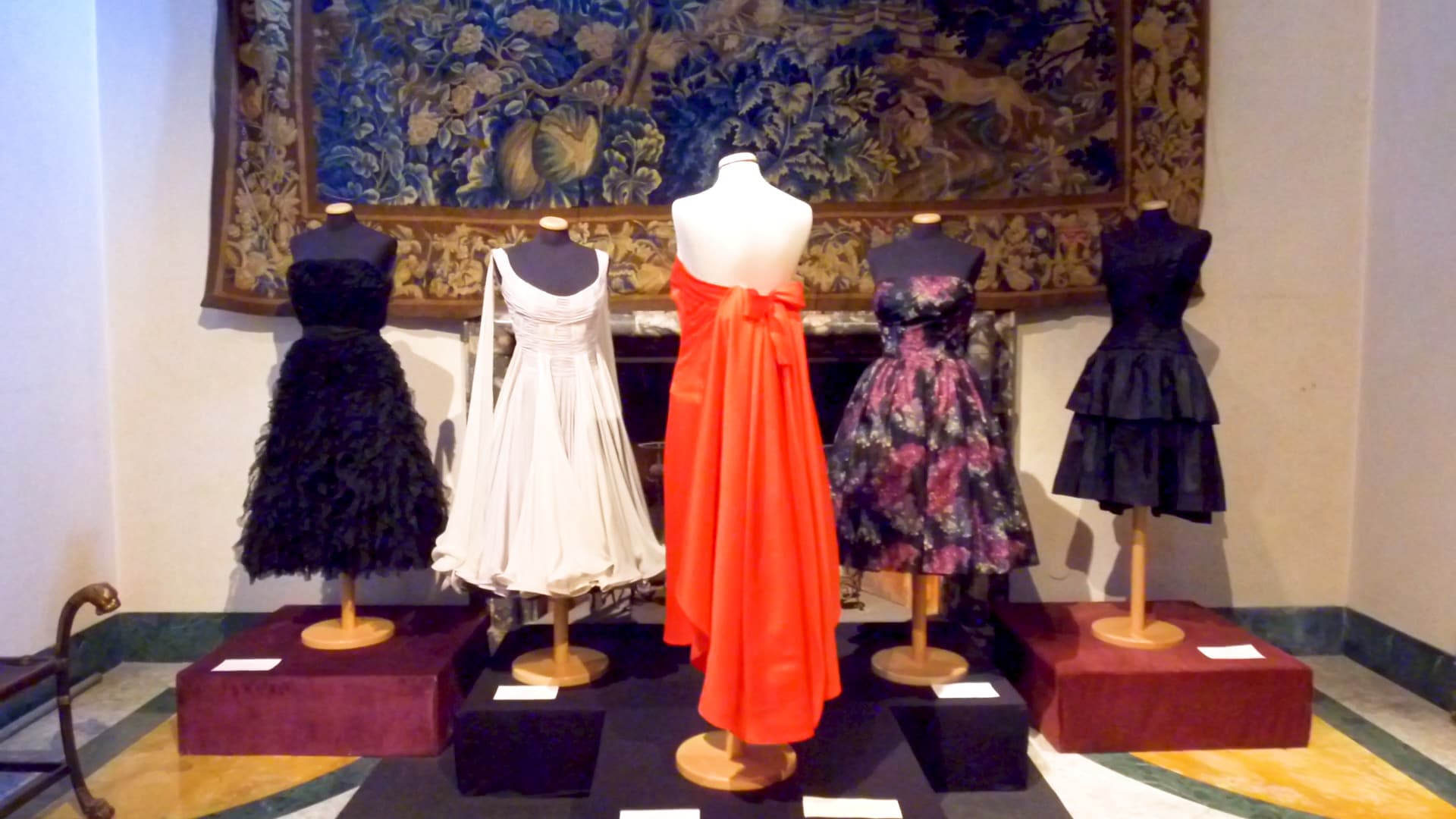 L'esposizione di alcuni capi di abbigliamento nella Galleria degli Arazzi al Museo Boncompagni Ludovisi.