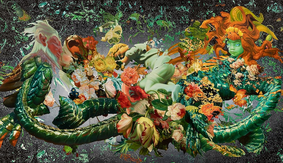 In copertina Rafael Megall Medea and Jason in my Blossoming Garden, 2023, trittico. Olio su tela, 250 x 480 cm.
