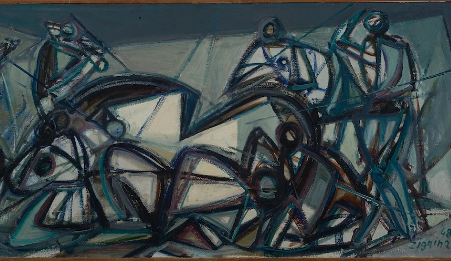 Giuseppe Zigaina, Uomini che uccidono cavalli, bozzetto preparatorio, 1948, olio su tavola, Casa Cavazzini, Museo di Arte Moderna e Contemporanea, UdineQuesta forza grafica sarà trasferita nelle opere successive con biciclette, falci e carri, tutti elementi che caratterizzano la pittura dell’artista in quegli anni.