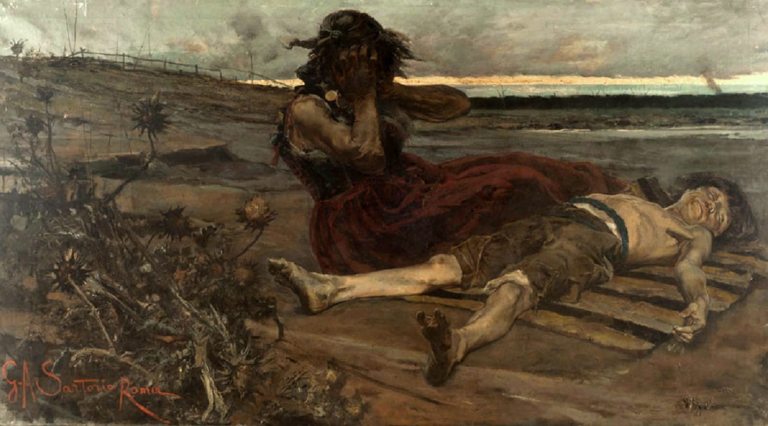 Giulio Aristide Sartorio, Malaria, 1883, olio su tela, 125x223cm., Museo Nacional de Bellas Artes, Buenos AiresCon “Malaria”, pur mantenendo qualche vezzo pittorico spagnoleggiante, Sartorio s’ispirava al naturalismo di ascendenza caravaggesca, memore di Jusepe de Ribera nel crudo trattamento dei corpi e nell’atmosfera livida del paesaggio. Il dramma, ambientato in un desolato paesaggio dell’Agro Pontino romano, mostra in primo piano una madre che piange il figlio morto, un fatto di attualità, una denuncia sociale che accompagnava le inchieste in corso sulle condizioni sanitarie di poveri lavoratori vittime dell’ampia diffusione del morbo.