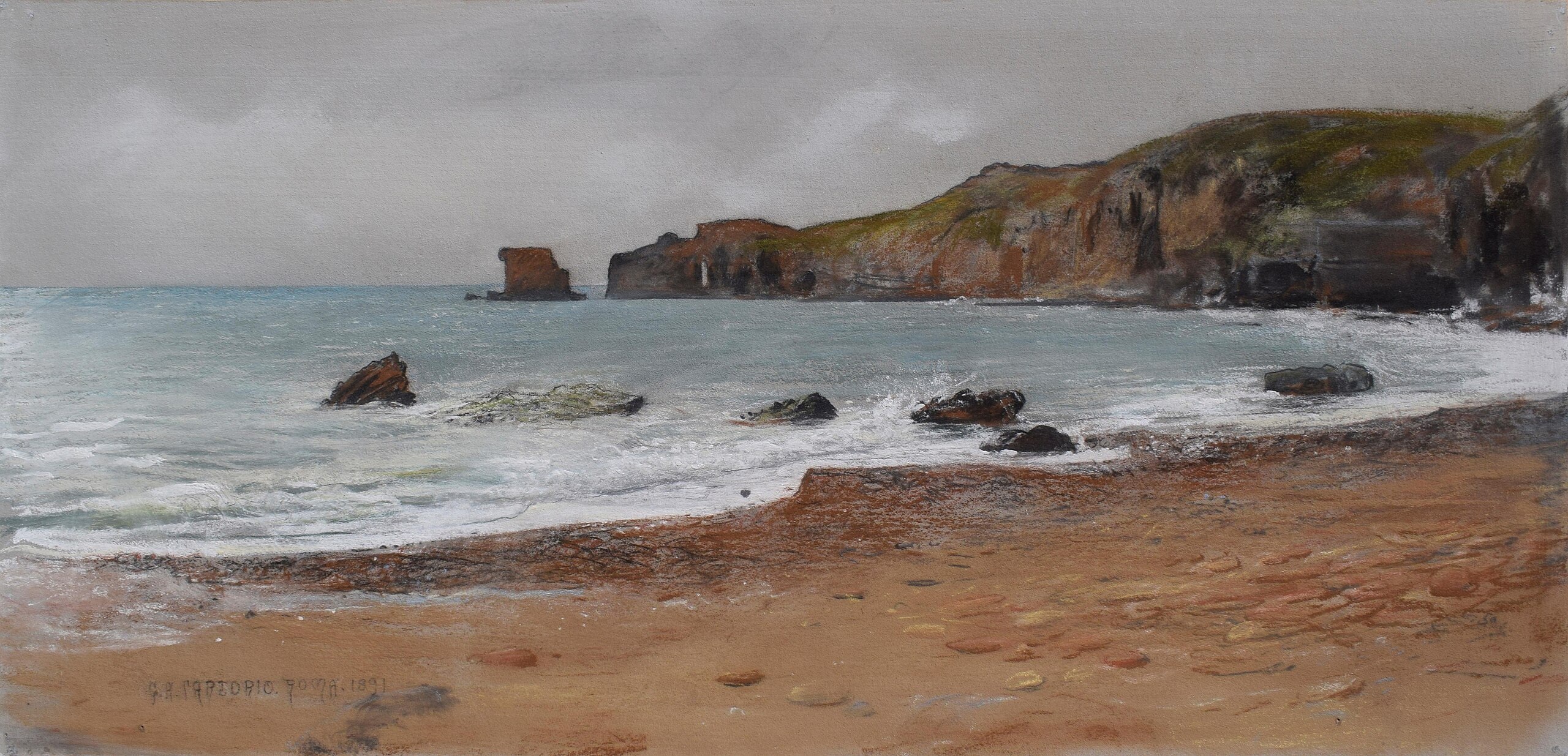Giulio Aristide Sartorio, Grotte di Nerone, Anzio, tecnica mista su cartone, 28x59cm., 1891, Collezione privataIl viaggio a Parigi fu una tappa importante per l’approdo di Sartorio alla poetica Simbolista; in compagnia con Michetti visitò la retrospettiva sui “paesaggisti di Barbizon”. Al ritorno, ospite dell’amico a Francavilla al Mare, inizia a realizzare paesaggi, un genere finora trascurato al quale presto si appassiona coltivando un fertile terreno per la sperimentazione e la ricerca. Risalgono agli anni Novanta dell’Ottocento i primi pastelli dal vero della campagna romana nei quali emerge un nuovo sentimento per un “paesaggio interiore”, percepito nell’universale e inscindibile rapporto con l’uomo e la sua memoria. Sono dipinti studiati a partire da una primitiva impressione colta dal vero e poi rielaborata in un processo interpretativo di selezione e astrazione con una tecnica sperimentale attenta agli effetti prodotti, anche grazie all’ausilio della fotografia che suggeriva nuovi tagli visivi, una monumentalità concentrata in piccoli formati e una peculiare luminosità.