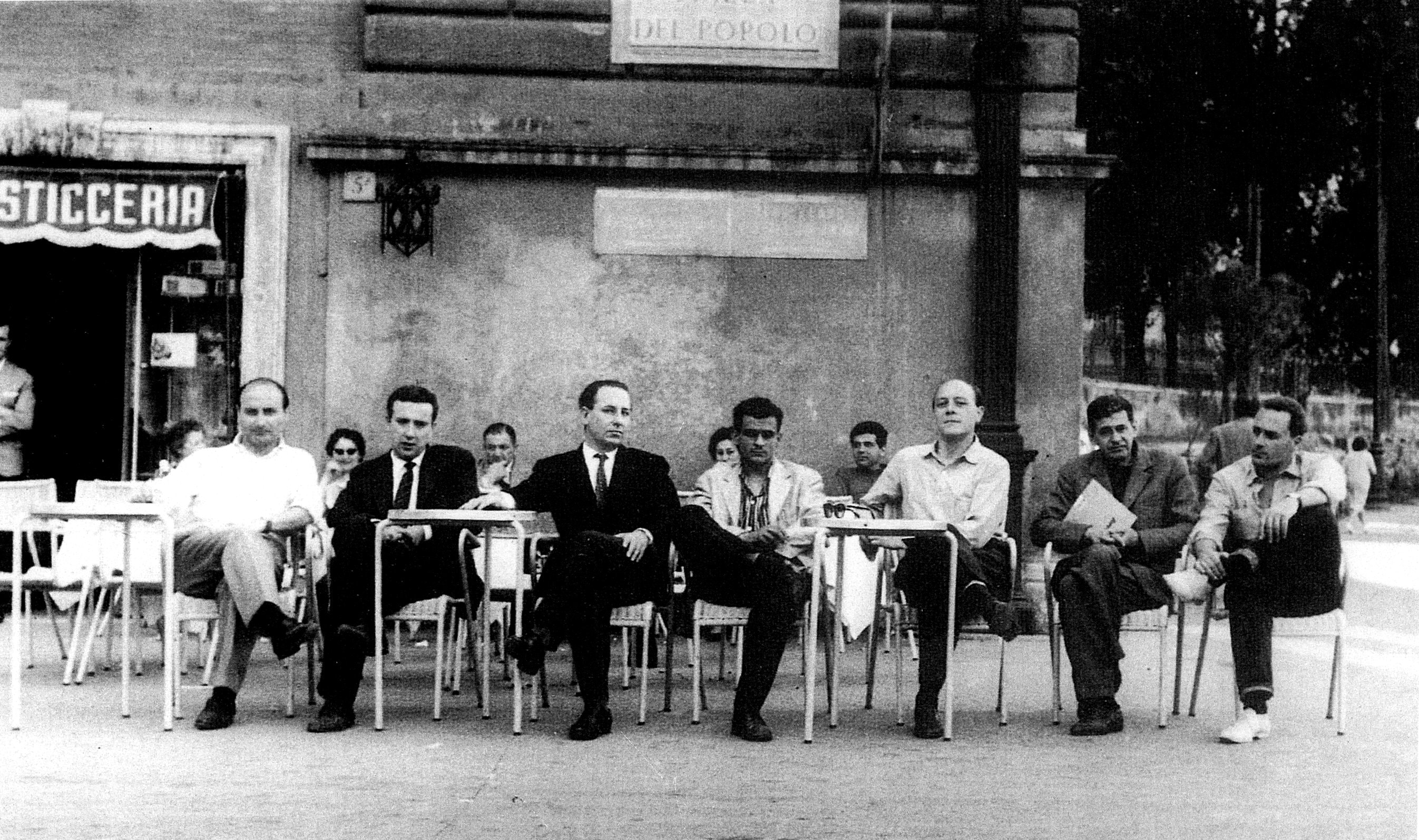 In ordine: Mimmo Rotella, Achille Perilli, Fabio Mauri, Gino Marotta, Piero D'Orazio, Giulio Turcato e Gastone Novelli al caffè Rosati di Piazza del Popolo, Roma 1960 - Foto di Virginia Dorich Dorazio © Courtesy Fabio Mauri Estate e Hauser & Wirth
