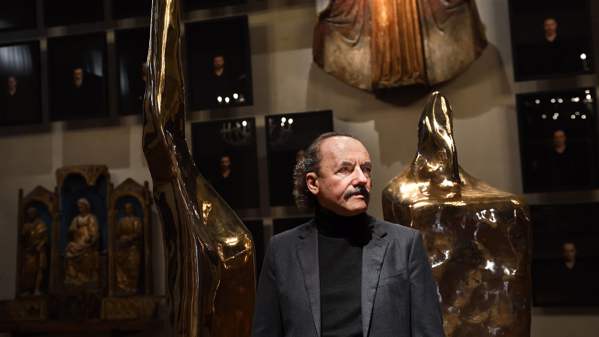 Dialogano con le altre opere a parete due sculture: Erme aurea, in bronzo tirato a specchio, e Meteorite, un bronzo alto oltre due metri che introduce una tensione verticale nello spazio.