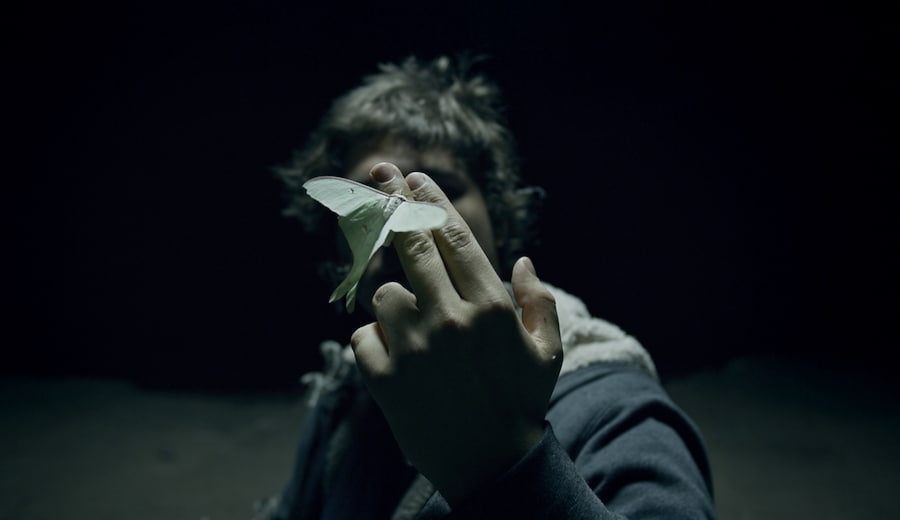 L’immagine scelta dall’artista è Icarus (2021-2022), ultimo tassello di un articolato progetto realizzato da Giorgio Andreotta Calò a partire dal 2019. Dalla penombra emerge in primo piano una falena, le cui ali nascondono il volto di un ragazzo che sembra offrirle, con gesto gentile, la mano come sostegno. Il lepidottero e il giovane appaiono in comunicazione, e per un attimo le ali sottili della falena sembrano diventare un’estensione delle dita del ragazzo, come in un principio di metamorfosi che si innesca al calar del sole. L’imbrunire diventa così il momento delle possibilità, quel territorio di passaggio tra il conosciuto e l’ignoto in cui un adolescente si trasforma in un giovane uomo e, spiegando per la prima volta le sue ali ancora fragili, accoglie la responsabilità di diventare adulto e volare solo nel mondo.