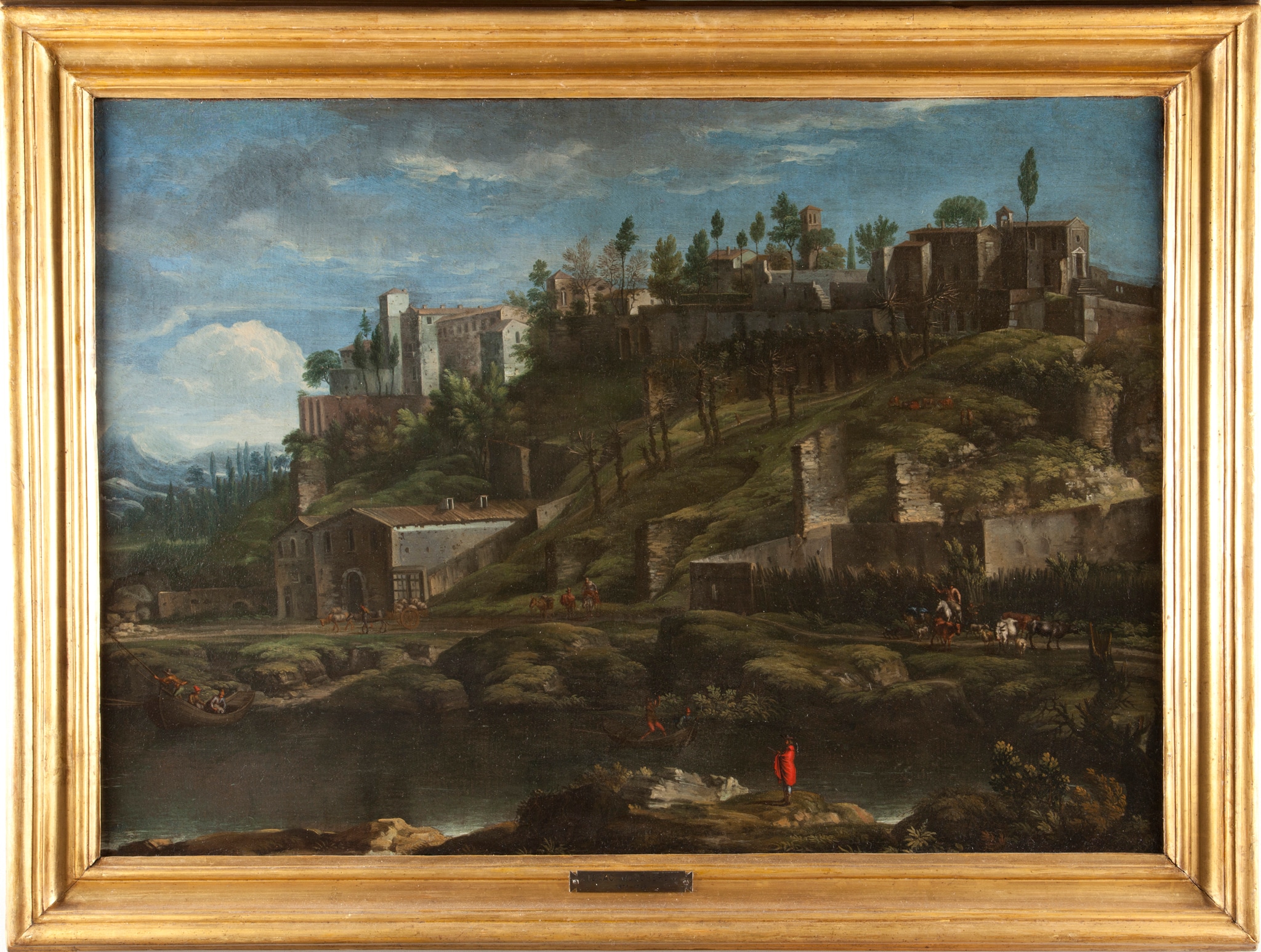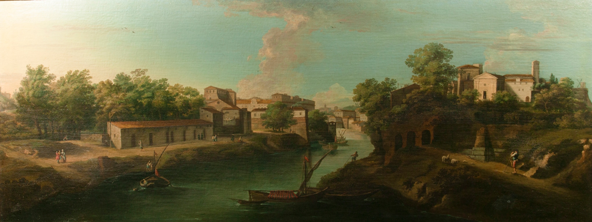 La tela dell'artista olandese Isaac de Maucheron (1667–1744), Il Tevere con l’Aventino e la chiesa del Priorato (foto n. 1), è una veduta inquadrata dal Porto di Ripa Grande. Il giovane artista in tour a Roma e appassionato di paesaggio, propone una veduta oggettiva, quasi topografica, prova dell'influenza del vedutista olandese Gaspar van Wittel (1653–1736), vissuto tra Napoli e Roma (padre dell'architetto Luigi Vanvilelli), le cui ampie viste panoramiche del Tevere, realizzate a inizio Settecento, anche con camera ottica, erano molto contese dal patriziato romano. I paesaggi veri, di tradizione nordica, erano stati introdotti nella Roma barocca da un altro olandese, Cornelis van Poelenburgh (1594/95-1667), pittore del gruppo nord-europeo dei Dutch Italianates, che in Italia e soprattutto a Roma, apprese dagli artisti locali l'introduzione di piccole figure e rovine. Come van Wittel, anche de Maucheron restituisce dettagli di vita quotidiana per rendere la scena più credibile, ma rispetto ai paesaggi veritieri della campagna di Tivoli, in quest'opera de Maucheron tentenna tra visione di fantasia arcadica e veduta reale. De Moucheron restringe il cielo e concentra il paesaggio in dettagli orografici, come il Clivo Publicio romano, antico accesso al colle della plebe e le saline, intuibili a sinistra sopra il gruppetto di astanti. L'olio risale probabilmente al soggiorno romano dell'artista (1697-98), dato il forte contrasto luminoso tipico della pittura tardo Barocca.