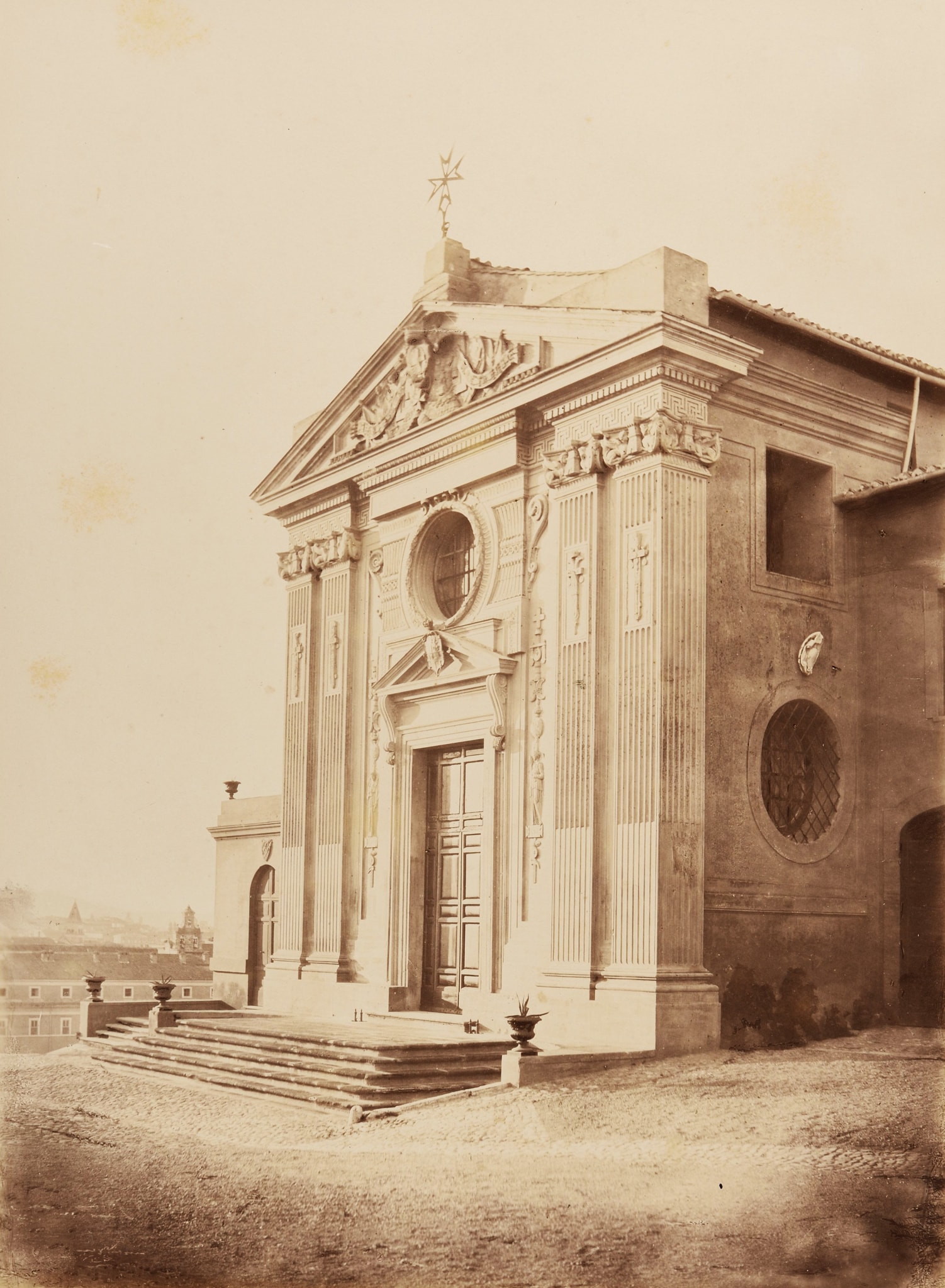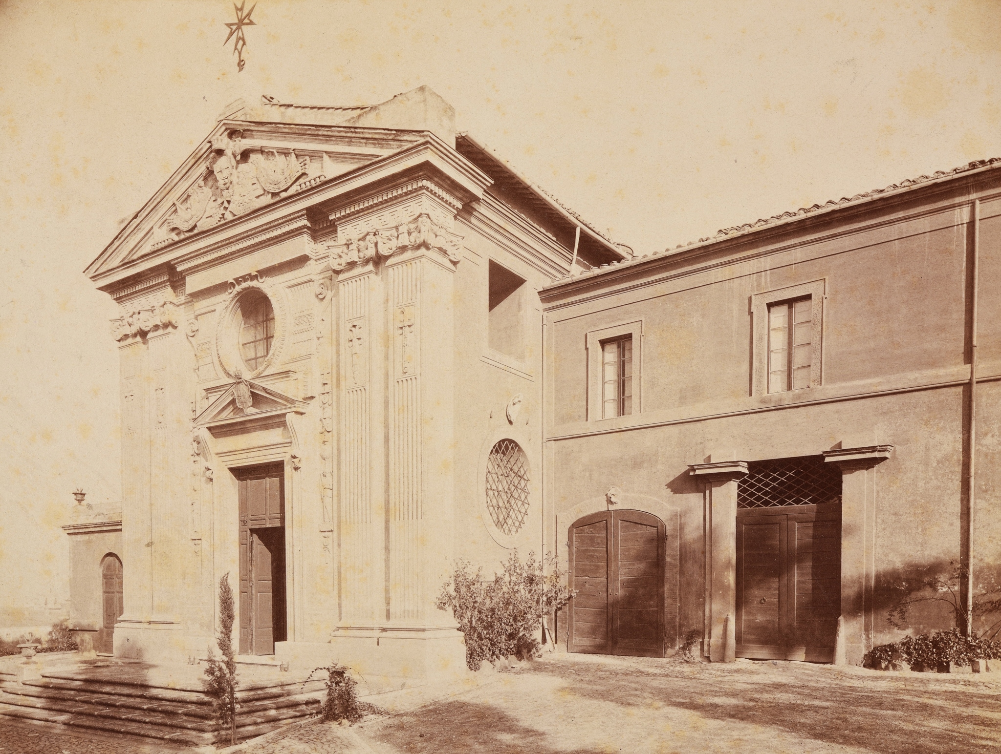Facciata principale della Chiesa. Villa del Sovrano Ordine di Malta all'Aventino (foto n. 7), inquadra la chiesa del Priorato di lato, una tipica prassi della foto di architettura Alinari che così, catturava più dettagli in un unico scatto. Lo stemma di Fra' Giovanni Battista Ceschi a Santa Croce (1827–1905), sopra la porta della chiesa, è un utile indizio per prevedere la data dello scatto, tra il 1871 e il 1877. Ceschi, luogotenente (1871) e poi Gran Maestro dell'Ordine (1879-1905), tra il 1876 e il '77, fu il fondatore dell’Associazione dei Cavalieri Italiani del Sovrano Militare Ordine di Malta, per mezzo del quale l’Ordine amministrava e gestiva le proprie strutture ospedaliere e di beneficenza sul territorio della penisola.Dopo metà Ottocento, il Complesso del Priorato torna soggetto di alcuni scatti fotografici che restituiscono momenti di storia dell'Ordine dei Cavalieri di Malta, assieme ai primi radicali cambiamenti urbanistici che daranno a Roma l'assetto di capitale d'Italia. Roma perdeva per sempre il suo straordinario paesaggio stratificato di storia, con i suoi monumenti antichi a cielo aperto ovunque disseminati che, nel Settecento, era stato catturato da artisti provenienti da ogni parte