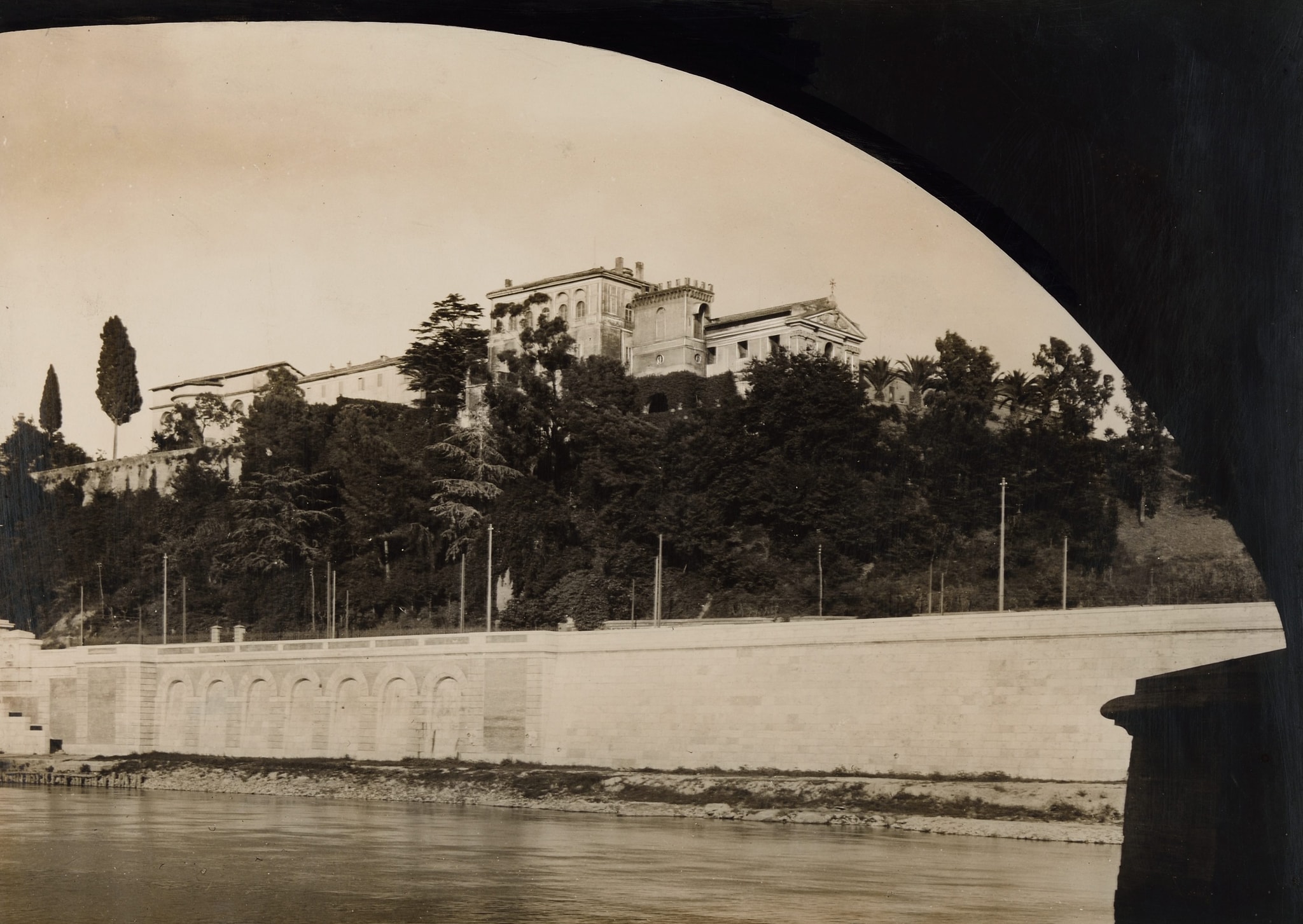 Veduta di Villa Magistrale e Chiesa Santa Maria in Aventino, dalla riva destra del Tevere, sotto un'arcata del Nuovo Ponte Sublicio (foto n. 15), è probabilmente un altro scatto dello Studio Felici, che voleva mostrare il Complesso di Villa Magistrale in occasione del compimento dei muraglioni sul Tevere, proprio nel 1926. Con un taglio fotografico molto audace, il fotografo dell'epoca restituiva questa cartolina dell'Aventino con il cavalletto sulla riva destra del fiume, sotto un'arcata del Nuovo Ponte Sublicio.