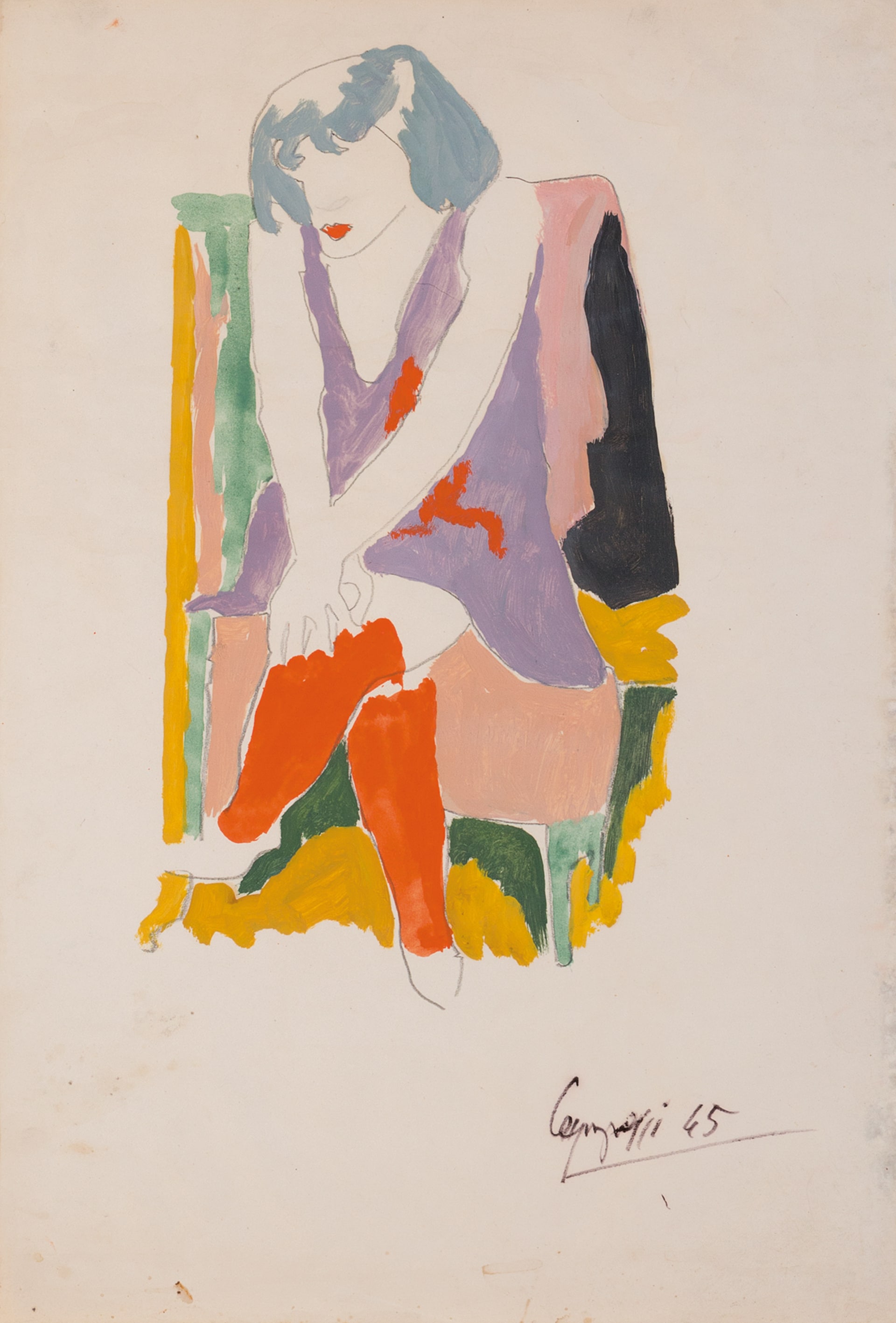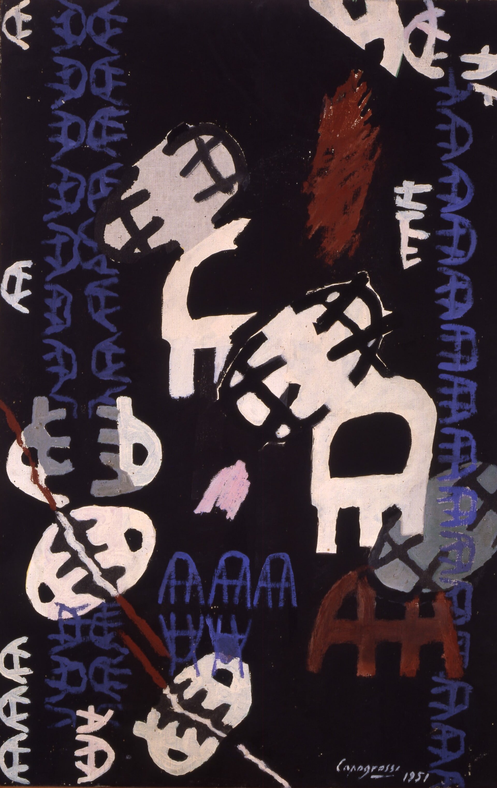 In mostra, una selezione di oltre trenta dipinti e una ventina di opere su carta provenienti dalle collezioni della Galleria Nazionale, sede del più cospicuo nucleo di opere dell’artista, dalla Fondazione Archivio Capogrossi e da collezioni private. Completano l’esposizione documenti d’archivio provenienti dai fondi documentari dell’artista conservati nell’Archivio della Galleria e presso la Fondazione, come ritratti fotografici di Capogrossi con personaggi di spicco dell’epoca, cataloghi di mostre, riviste, lettere e articoli di giornale, che ricostruiscono le relazioni intessute dall’artista.