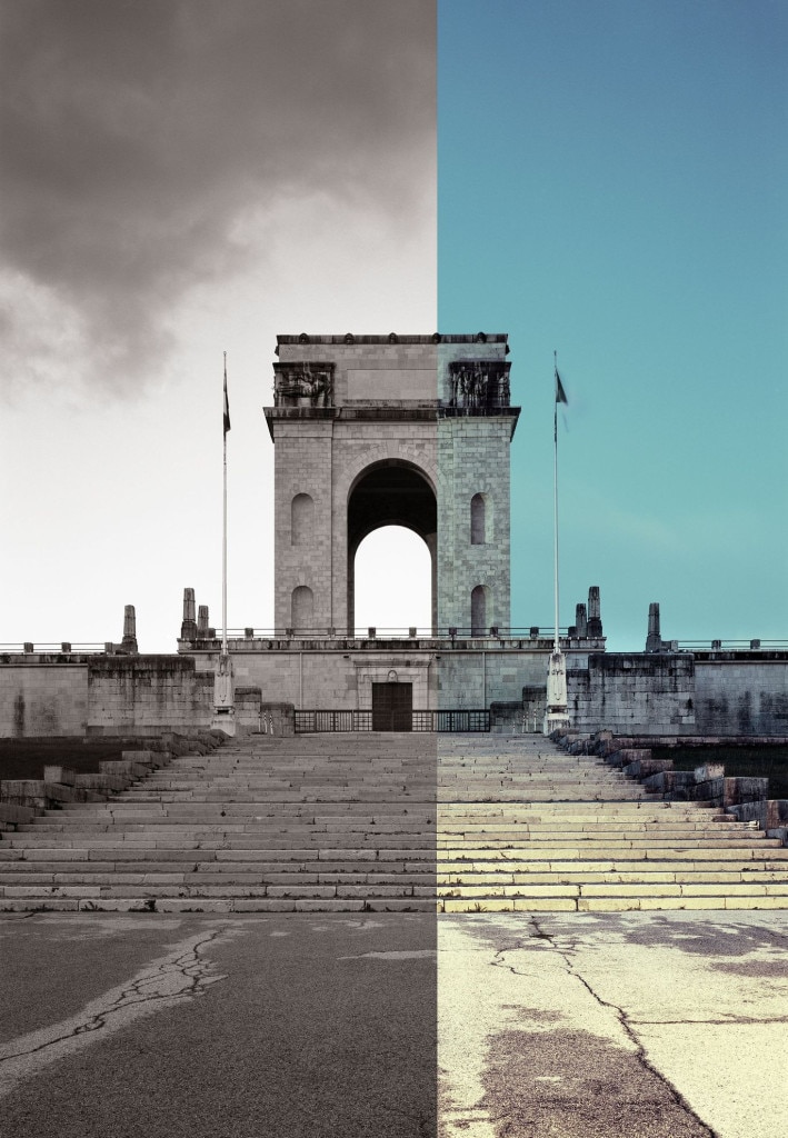La ricerca di Claudio Gobbi ruota attorno al tema del monumento architettonico in quanto veicolo di contenuti simbolici, con particolare riferimento a quelli costruiti negli anni Venti e Trenta nel Nord-Est d’Italia. Una parziale e circoscritta geografia della memoria che riflette su un fenomeno largamente diffuso che ha segnato in modo capillare il paesaggio italiano. Ogni singola fotografia è il risultato di una pluralità di riprese avvenute dallo stesso punto di vista in fasi diverse della giornata. Luce naturale e luce artificiale, bianco e nero e colore, affiancati per costruire una serie di immagini che incorporano diverse temporalità.