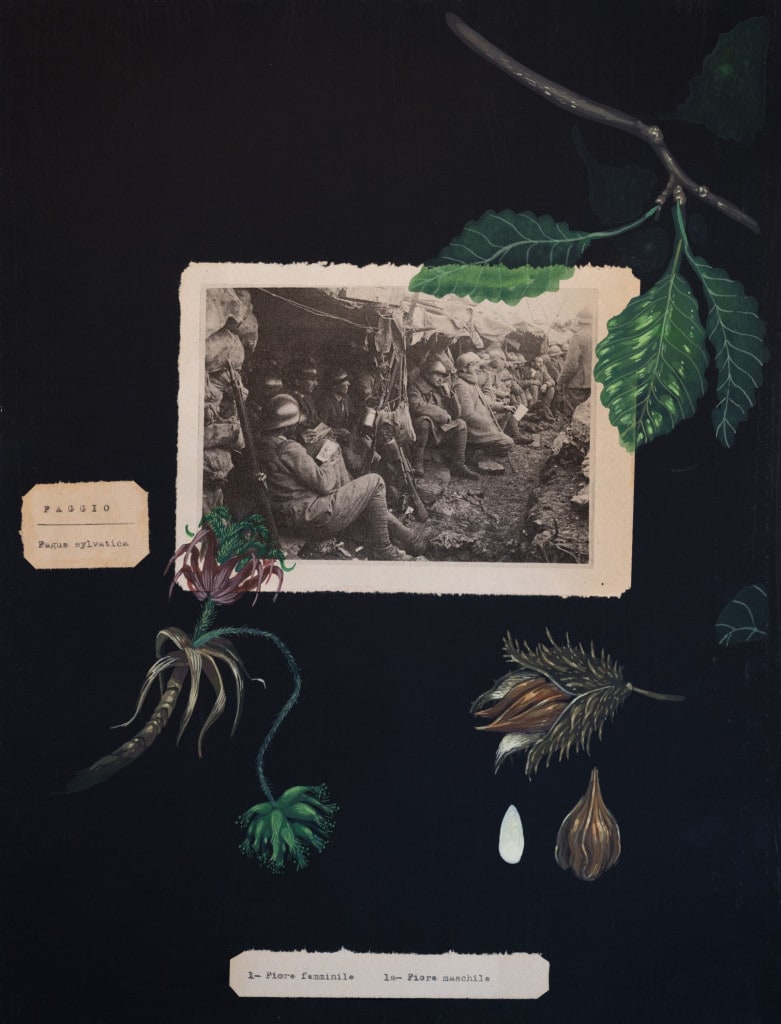 Hitnes propone una serie di tavole che illustrano il profondo legame fra i diversi elementi: botanica e memoria, alberi e uomini, didascalie e fotografie tratte dall’immenso archivio storico conservato in ICCD. Un intreccio rafforzato dalla scelta stilistica di sottolineare le somiglianze fra i due elementi rappresentati: alberi e soldati caduti. Il fondo nero delle opere, come suggerisce l’artista stesso, da una parte evoca la morte e l’oblio, dall’altra è funzionale ad esaltare la luce degli uomini e degli alberi che ospita, facendoli emergere in tutta la loro natura di “memorie viventi”.