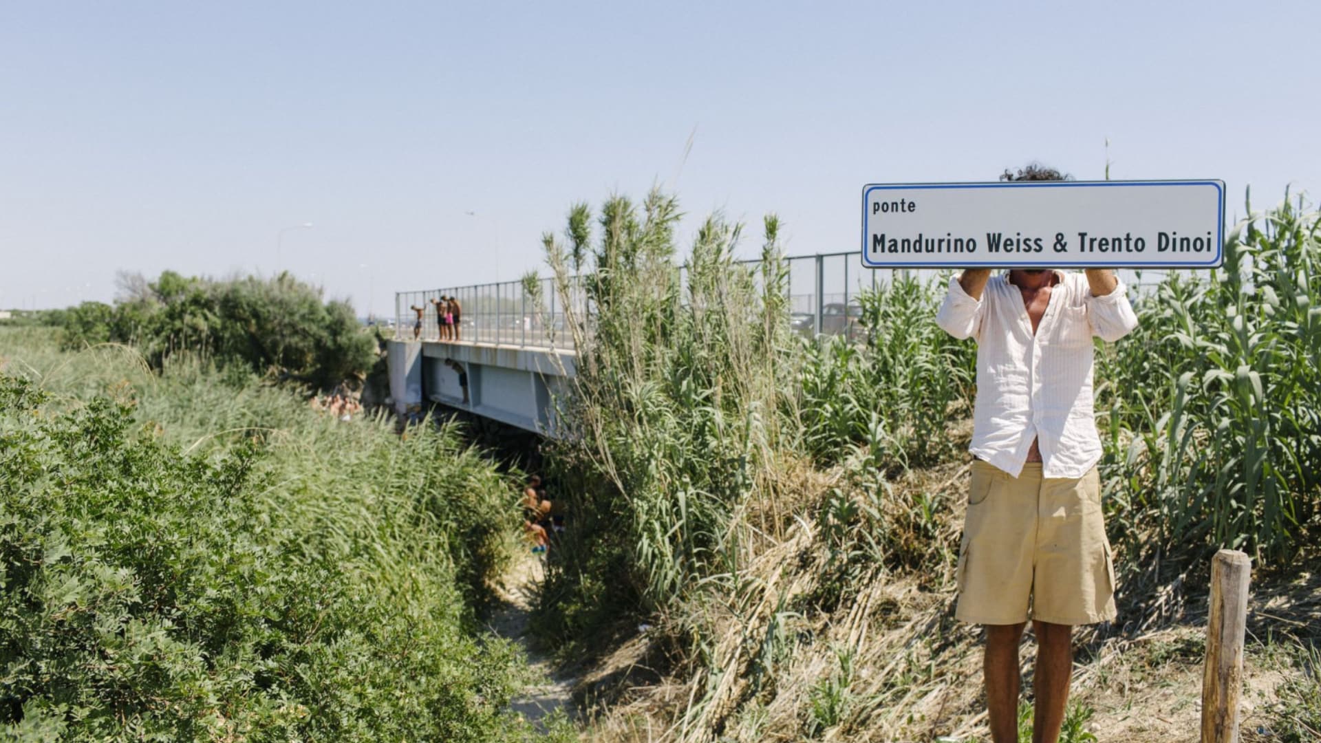 La performance di Fabrizio Bellomo riattiva una delle tante storie esemplari dei profughi della Grande Guerra, incarnata nella singolare vicenda di Mandurino Weiss e Trento Dinoi, nati lo stesso giorno del 1916. L’intreccio geografico dei nomi, uno riferito al Trentino e l’altro alle terre pugliesi, testimonia un gesto di riconoscenza e affetto reciproco che le famiglie dei due bambini si scambiarono quando a Manduria vennero accolti i trentini. Nell’azione performativa l’artista si pone provocatoriamente e ironicamente come “palo umano” e, reggendo un cartello stradale con i nomi, si posiziona nei pressi di un ponte di Manduria affinché esso venga intitolato ai due bambini. Oltre alle fotografie sono riportati, come parte organica del lavoro, una serie di screenshots e ritagli stampa, utilizzati dall’artista per sottoporre la sua azione all’attenzione dei politici locali.