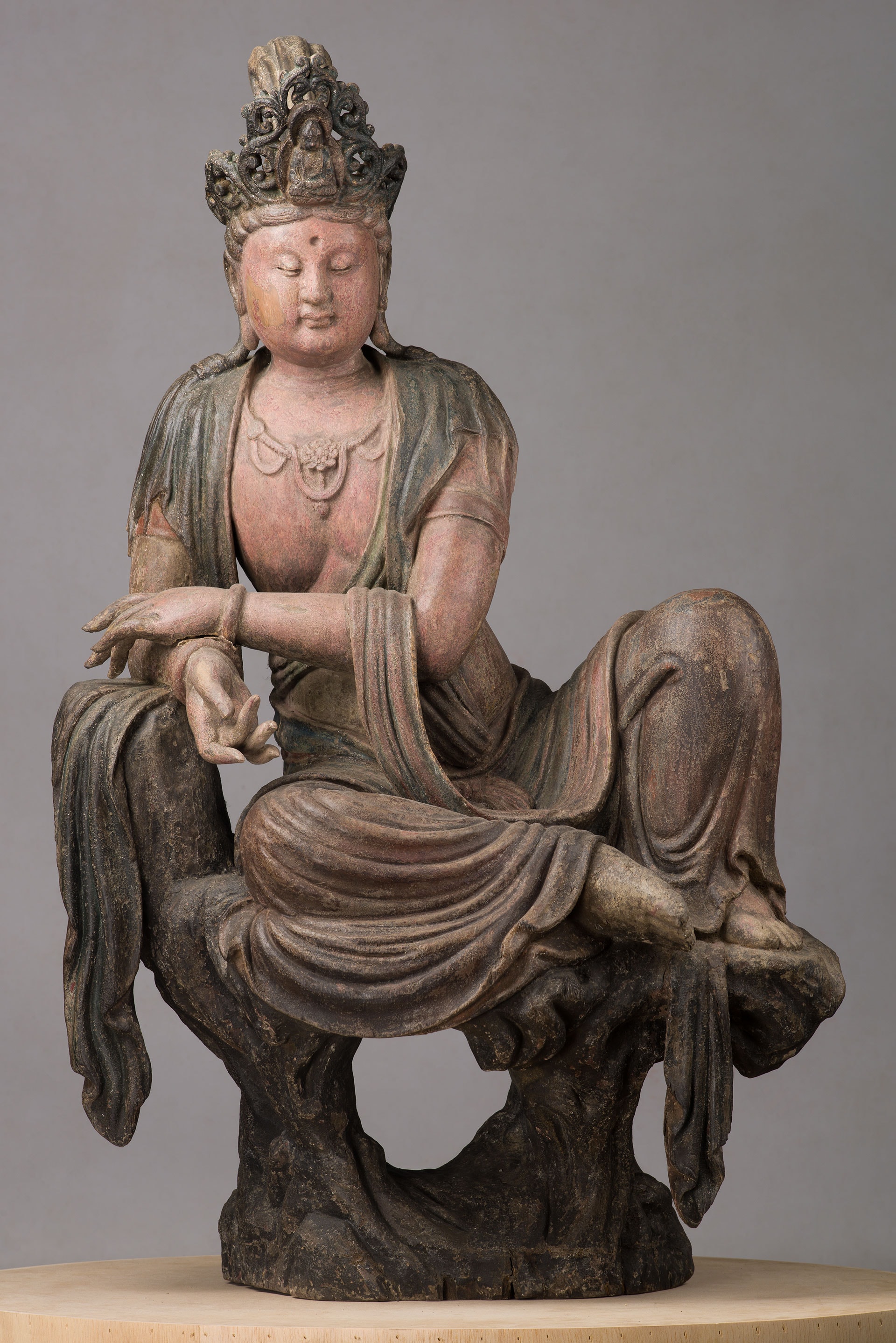 Statua di Avalokiteśvara (Guanyin) sdraiato raffigurante Avalokiteśvara adagiato in mahārājalīlāsana su una roccia (112 x 70 cm). La statua, realizzata nel XVII sec in legno e lacca con policromia sotto la dinastia Ming - Qing, proviene da Shanxi o Shaanxi © CCR ph Silvano Pupella
