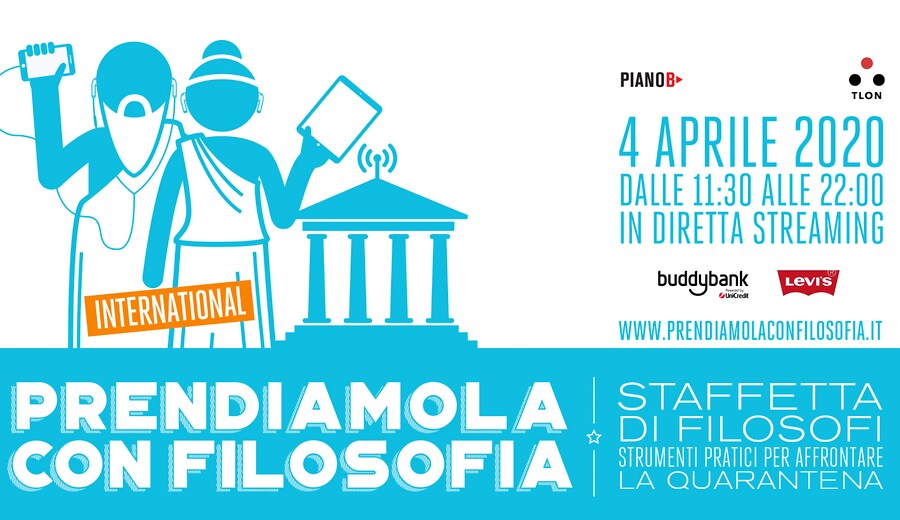 Il prossimo 4 aprile 2020, dalle 10 del mattino fino alle 22, si terrà una seconda staffetta in streaming che avrà come protagonisti grandi nomi del panorama culturale mondiale. Ideata dall’agenzia Piano B e dal progetto filosofico Tlon - condotto da Maura Gancitano e Andrea Colamedici - la giornata verrà trasmessa in diretta streaming su www.PrendiamolaConFilosofia.it.