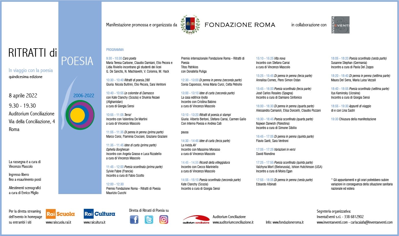 Ritratti di Poesia, manifestazione promossa e organizzata da Fondazione Roma è una rassegna di poesia contemporanea italiana e internazionale che si svolge a Roma dal 2006. La quindicesima edizione si è tenuta venerdì 8 aprile presso l’Auditorium Conciliazione.