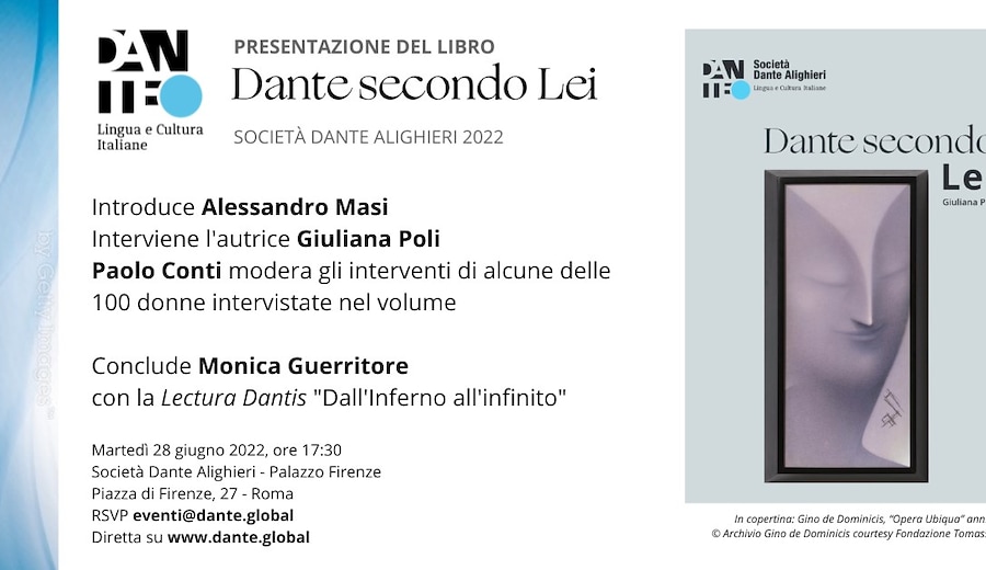 Le voci di 100 donne, il loro punto di vista su Dante e sulla condizione femminile sono il cuore del libro Dante secondo lei (Società Dante Alighieri 2022) che sarà presentato il prossimo 28 giugno alle ore 17.30 a Palazzo Firenze, in piazza di Firenze n. 27 a Roma, e si potrà seguire in diretta anche su www.dante.global.