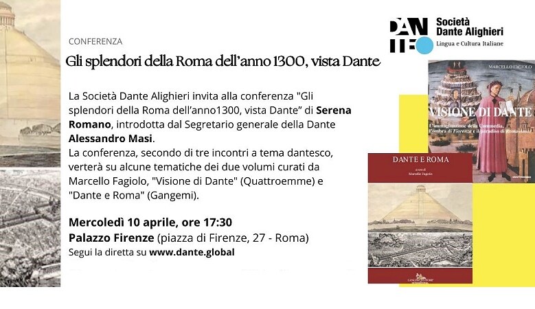 Mercoledì 10 aprile alle ore 17:30 a Palazzo Firenze (piazza di Firenze, 27 - Roma) la Società Dante Alighieri invita alla conferenza "Gli splendori di Roma dell’anno 1300, vista Dante” di Serena Romano. Si tratta del secondo incontro sulla Roma di Dante, sulle tematiche dei due volumi pubblicati da Marcello Fagiolo: Visione di Dante (edizioni Quattroemme, 2022) e Dante e Roma (Gangemi, 2022). La conferenza sarà introdotta da Alessandro Masi, Segretario Generale della Società Dante Alighieri.