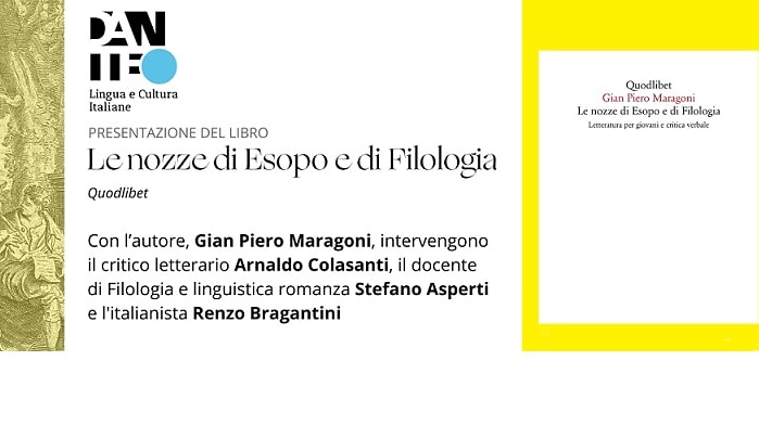 Mercoledì 1° marzo alle ore 17:30 a Palazzo Firenze (Piazza di Firenze, 27 - Roma) la Società Dante Alighieri presenta il libro di Gian Piero Maragoni “Le nozze di Esopo e di Filologia. Letteratura per giovani e critica verbale” (Quodlibet 2023).