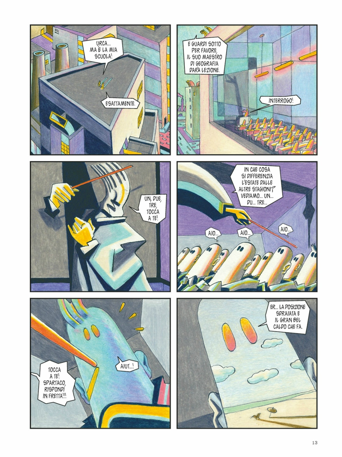 In questa storia sono già presenti tutti gli elementi che caratterizzano Spartaco, dalla commistione di grafica, poesia e fantasia allo stralunato personaggio col ciuffo che osserva la realtà con uno sguardo tutto interiore – Lorenzo Mattotti