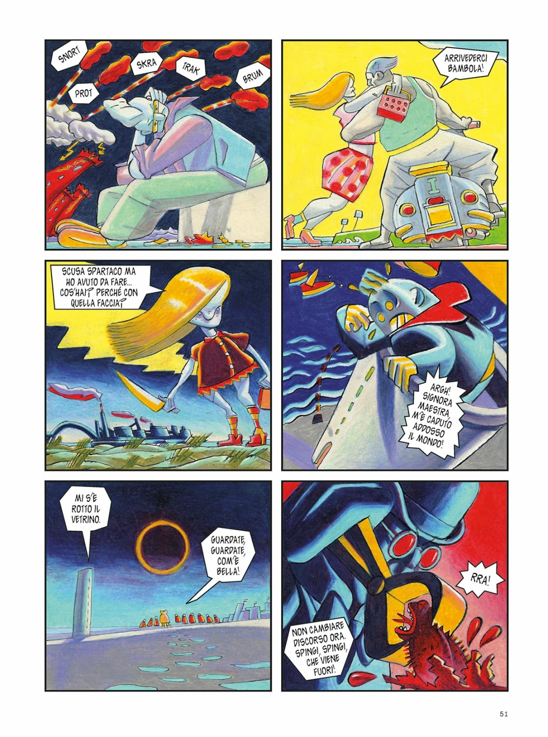 Tutto con Mattotti è (ri)partito da Il signor Spartaco e per questo oggi – tutti noi – possiamo tornare, con coscienza pienamente consapevole della sua importanza storica, a rileggere, con attenzione profonda e con piacere infante insieme, le gesta, immobili e dinamiche, di un Bonaventura spaurito alle prese con la violenta presa di coscienza del reale – Francesco Boille
