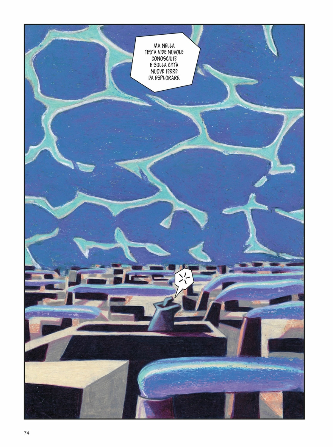 Il signor Spartaco. Viaggio di un epicentrico, pubblicato in Itala da Logos (e parte di un lodevole progetto editoriale che ripercorre l’evoluzione artistica del Mattotti fumettista), è un lavoro cruciale nella carriera artistica di Mattotti: pubblicato per la prima volta a puntate nel 1982 sulla rivista Alter Alter (poi in volume nel 1985), contiene per la prima volta alcuni degli elementi che da qui in poi caratterizzeranno inequivocabilmente il suo stile: l’ormai inconfondibile piglio visionario, fantastico, metafisico; l’uso del colore, qui utilizzando la tecnica mista di pastelli e pennarelli; ma anche i temi che anticipano il Mattotti più maturo: il ricordo, il sogno, l’inconscio, il percorso esistenziale dall’angoscia della linea d’ombra al raggiungimento dell’equilibrio.