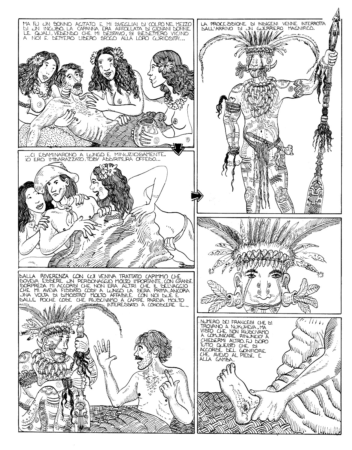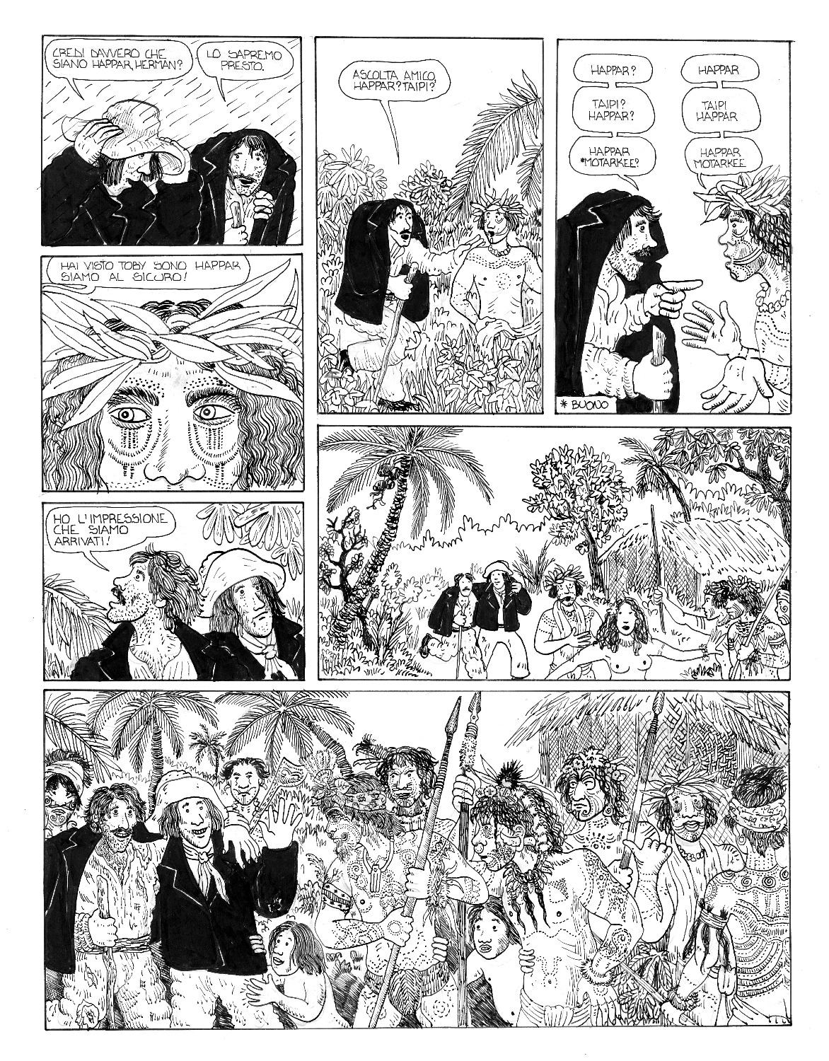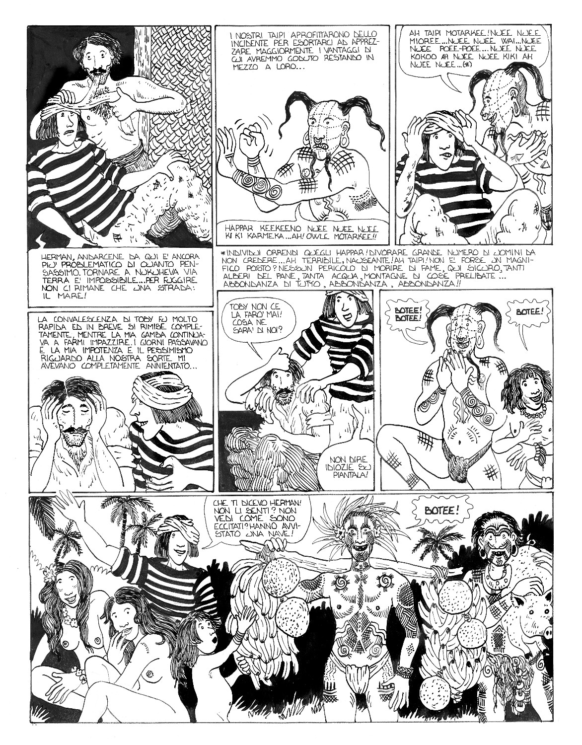 Il fumetto è uno splendido lavoro di sceneggiatura e illustrazione che ComicOut ha il merito di aver ripubblicato: disegni ispiratissimi nati non solo dall'evidente folgorazione dell’autore per questa storia, ma anche da un vasto studio storico e iconografico, raccontato da Guarnaccia nella premessa al volume. E se da una parte le illustrazioni rappresentano perfettamente lo stile dell'autore, dall'altra riescono sia a rievocare l’arte primitiva polinesiana e la cultura dei tatuaggi marinareschi, sia soprattutto lo stile narrativo dello stesso Melville, che si ritrova ad ogni tavola: nella costruzione sempre più intrigante dei personaggi così come nel susseguirsi sempre più avvincente degli eventi; nei puntuali elenchi di cetacei e specie vegetali dell'isola così come nelle descrizioni minuziose degli strumenti, delle imbarcazioni e dei riti degli indigeni che, alternandosi alla vicenda dei due fuggiaschi, invece di rallentare il ritmo vivacizzano la lettura e fanno respirare quel tipico stile melvilliano, incredibilmente capace di suscitare senso di meraviglia e curiosità al contempo per storia e personaggi così come per i dettagli più minuziosi dell’arte della baleniera, ancora oggi a più di 150 anni dalla prima pubblicazione, avvenuta nel 1856. Un talento di Melville che sarà poi sviluppato e portato al suo massimo apice nel capolavoro Moby Dick.