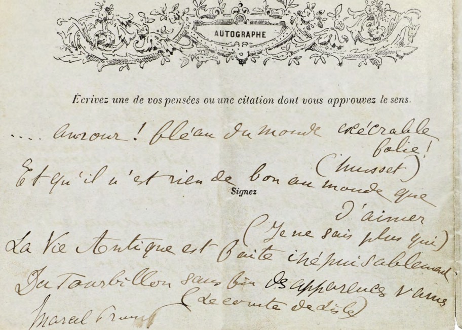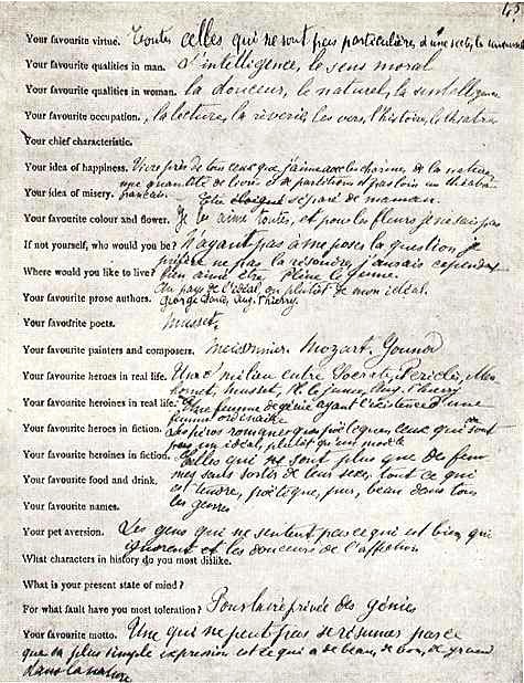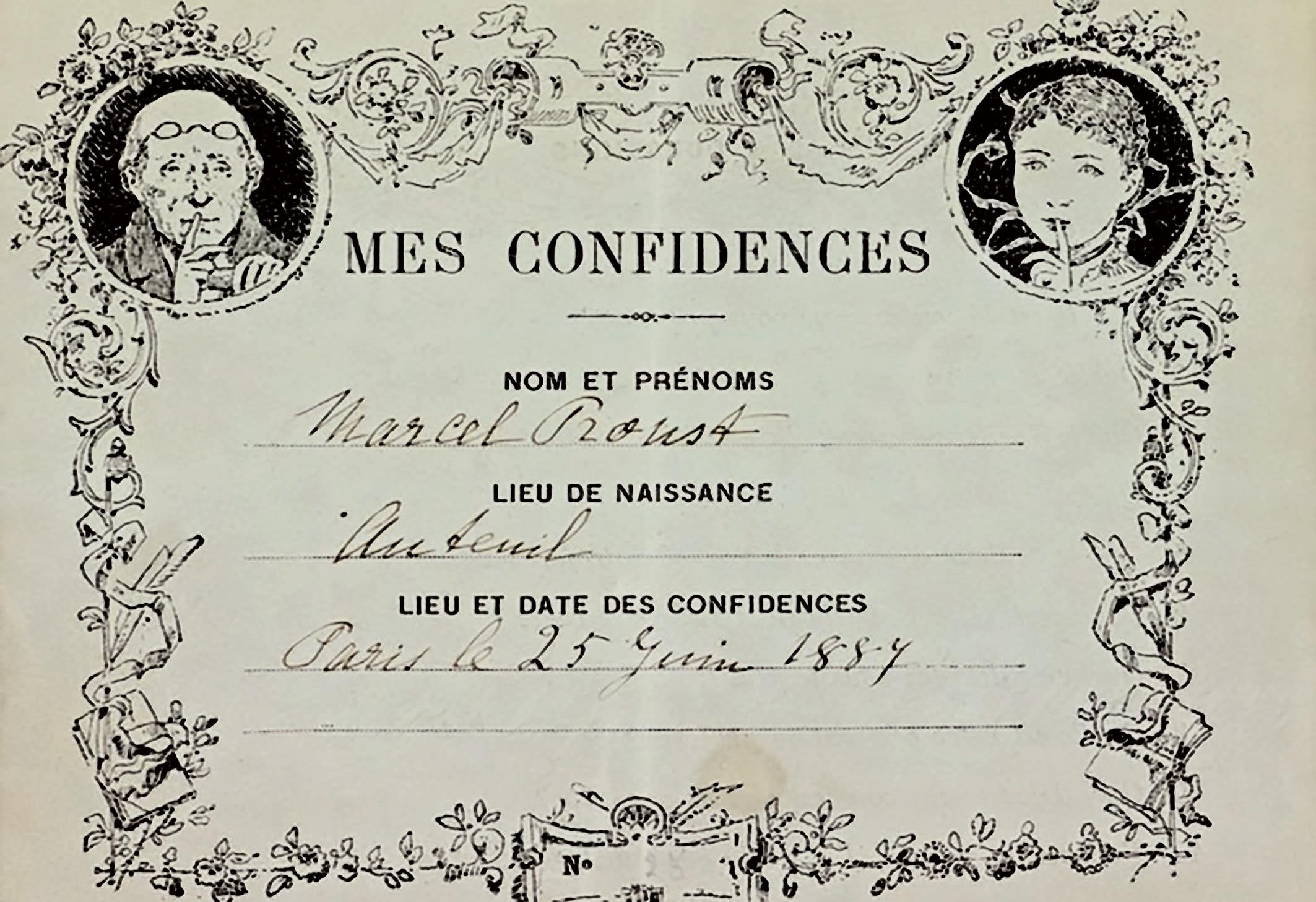 Il cosiddetto Questionario di Proust, porta il nome del grande scrittore francese perché alle sue risposte è associata la versione più celebre di uno dei molti questionari che da metà Ottocento circolavano come passatempo nella borghesia europea, soprattutto inglese e francese, e negli ambienti artistici e intellettuali dell’epoca (tra coloro che si appassionarono al questionario ci fu anche Oscar Wilde). La raccolta delle domande e delle relative risposte che Marcel Proust appena quattordicenne diede alla giovane amica Antoinette (figlia del futuro presidente francese Félix Faure), fu ritrovata molti anni dopo da uno dei figli della donna e pubblicata per la prima volta nel 1924.