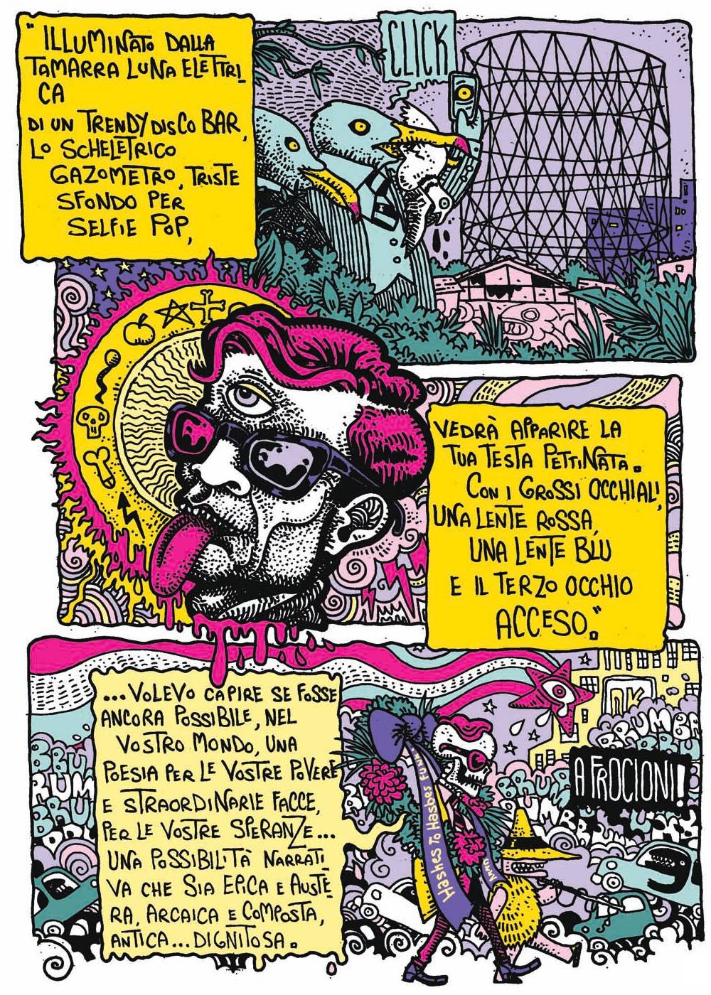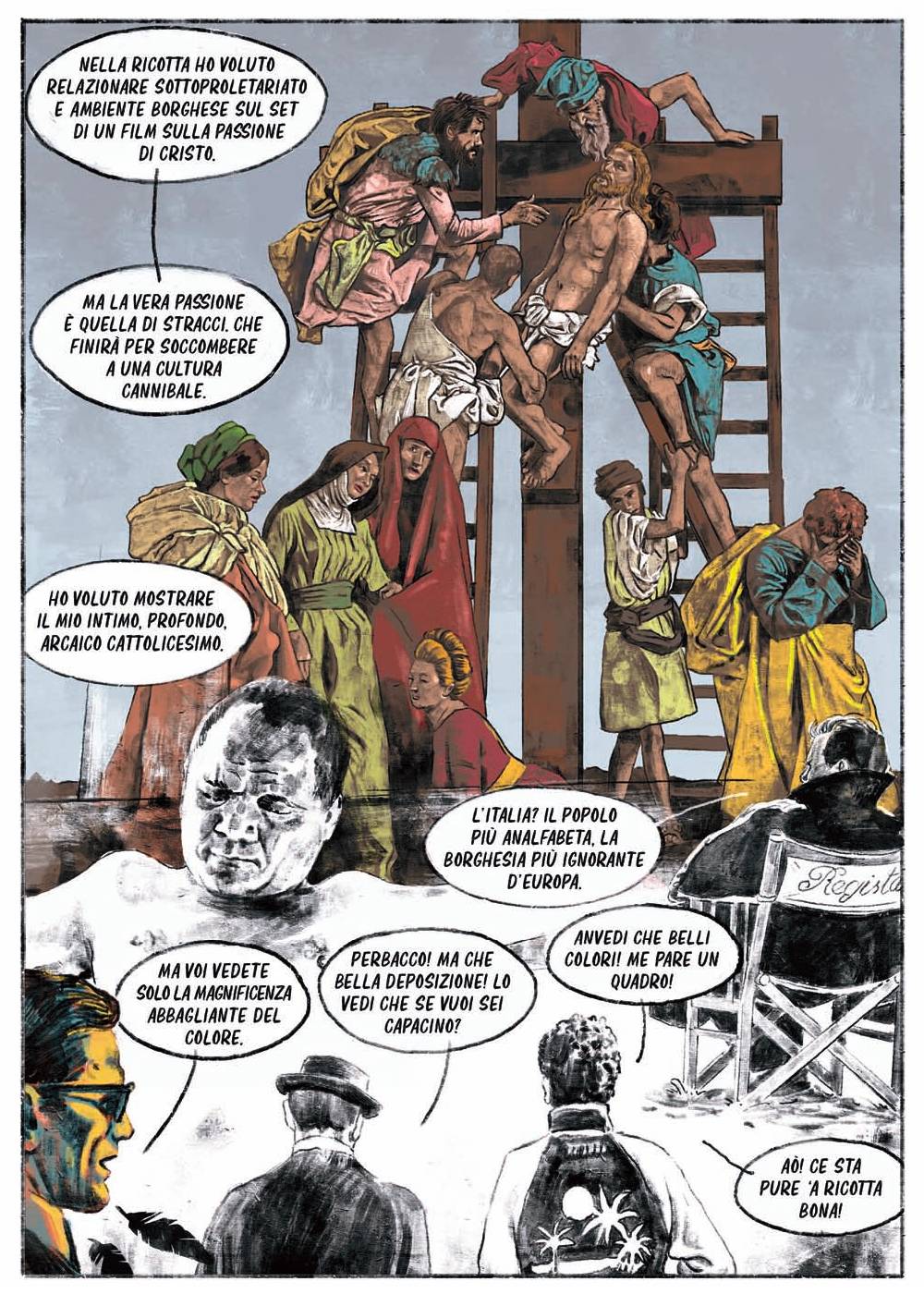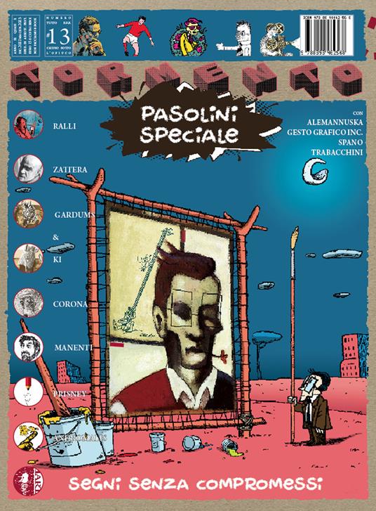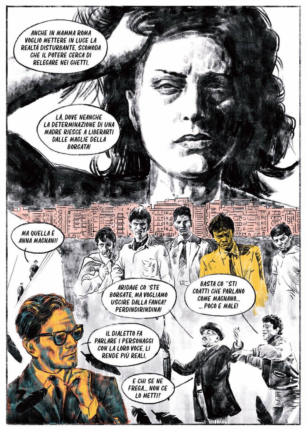Andromalis, Marco Corona, Gardums & Ki, Guglielmo Manenti, Andy Prisney, Alessio Trabacchini e gli stessi Luca Ralli e Nanni Spano arricchiscono il libro con i loro tratti e pigli creativi, attraverso fumetti, disegni, illustrazioni, collage, citazioni illustri e rivisitazioni in chiave pasoliniana di grandi classici del fumetto, tra cui Bill Watterson (Pupazzi di vita), Charles M. Shultz (PPPnuts) e Winsor McCay (Pisolini), che attraversano ciascuno col suo stile le molte facce di un autore di vastissima cultura, che amava sperimentare, e che ha saputo spaziare cimentandosi nella poesia, nella narrativa, nella saggistica, nel teatro, nel cinema, nella musica e non solo. E quindi in questa rivista immaginaria troviamo riferimenti più che reali agli Scritti Corsari, ai film e ai documentari (Comizi d’amore) del Pasolini regista, e a opere quali (tra le altre) Ragazzi di vita, Le ceneri di Gramsci, Petrolio.