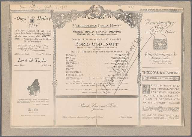Boris Godunov è la prima esperienza teatrale veramente compiuta di Modest Petrovič Musorgskij. La prima versione risale al 1868 – 1869 e fu respinta dai Teatri Imperiali. Solamente cinque anni dopo, il 27 gennaio 1874, poté accedere al Teatro Mariinskij di Pietroburgo, in una seconda e più ampia versione (1871 – 1872) che riscosse un grande successo.