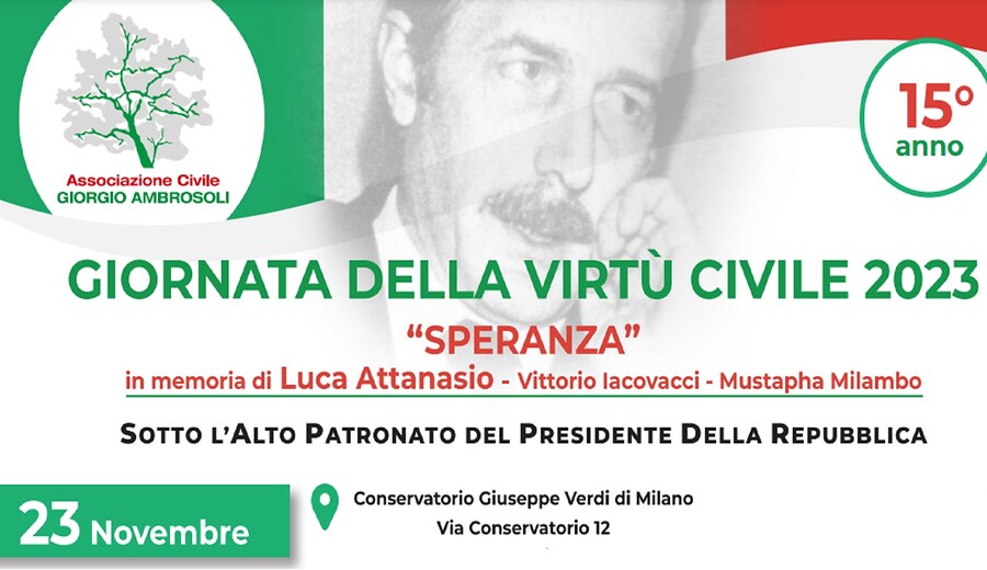 Il 23 novembre si è svolta la 15esima edizione della Giornata della Virtù Civile, promossa dall'Associazione Civile Giorgio Ambrosoli. Quest'anno l'iniziativa si è svolta in memoria dell'Ambasciatore Luca Attanasio, il carabiniere Vittorio Iacovacci e l'autista Mustapha Milambo.