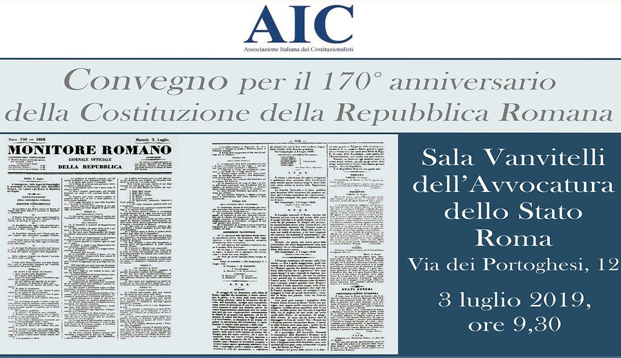 Il 3 luglio p.v. alle ore 9:30, presso la Sala Vanvitelli dell’Avvocatura dello Stato, si terrà il convegno per il 170° anniversario della Costituzione della Repubblica Romana. L'evento è organizzato dall’Associazione Italiana Costituzionalisti.