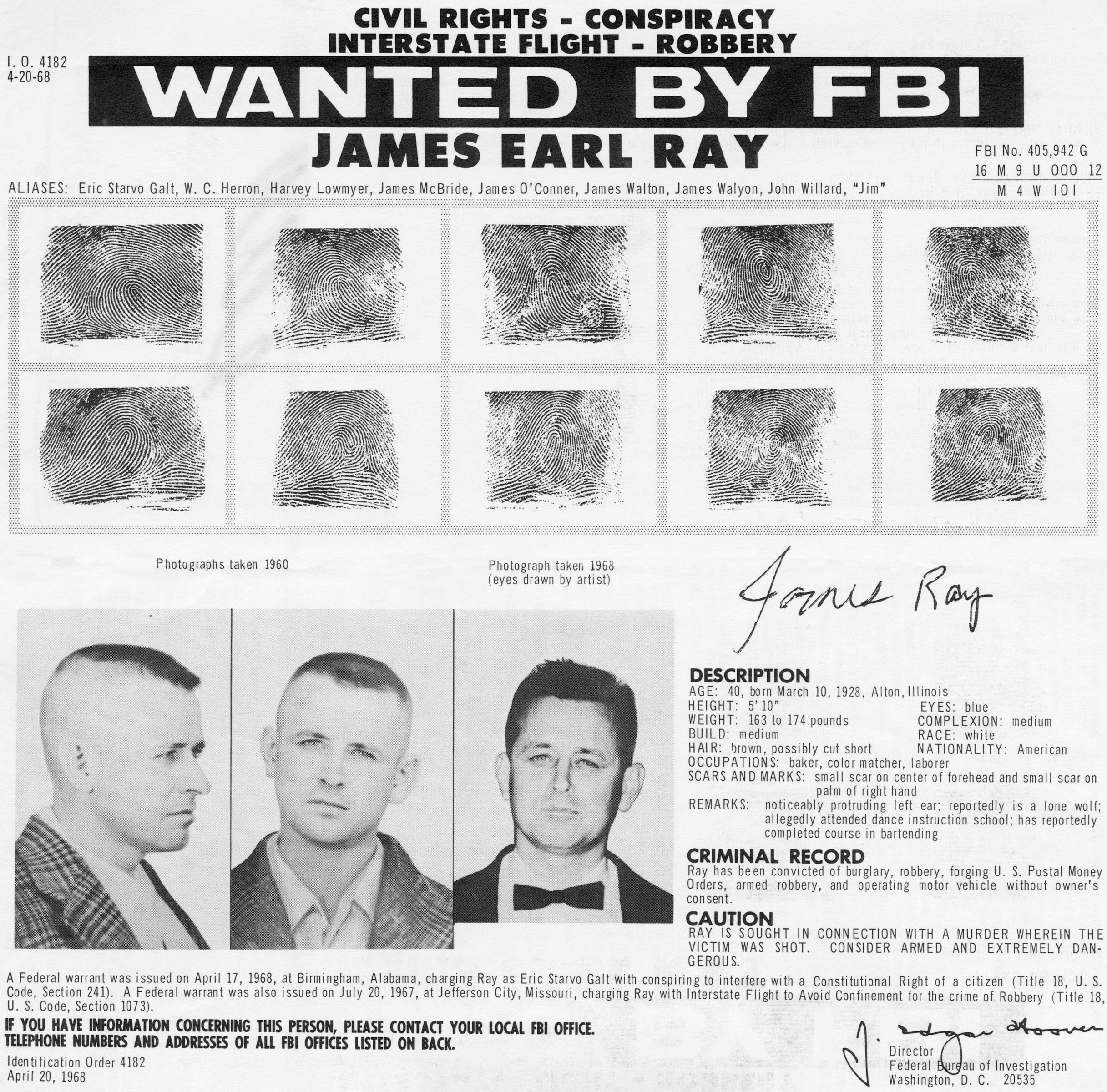 Viene catturato circa due mesi dopo a Londra, mentre cerca di lasciare l'Europa. Sostiene di non essere stato lui a sparare, ma di sapere il nome del vero assassino. Muore però il giorno dopo l'arresto, accoltellato nella cella dove è rinchiuso. Ancora oggi rimangono diverse ombre sull'omicidio di Martin Luther King.Mentre si trova sulla veranda del suo albergo, viene raggiunto da un colpo di fucile, sparato dalla casa di fronte da un fanatico razzista