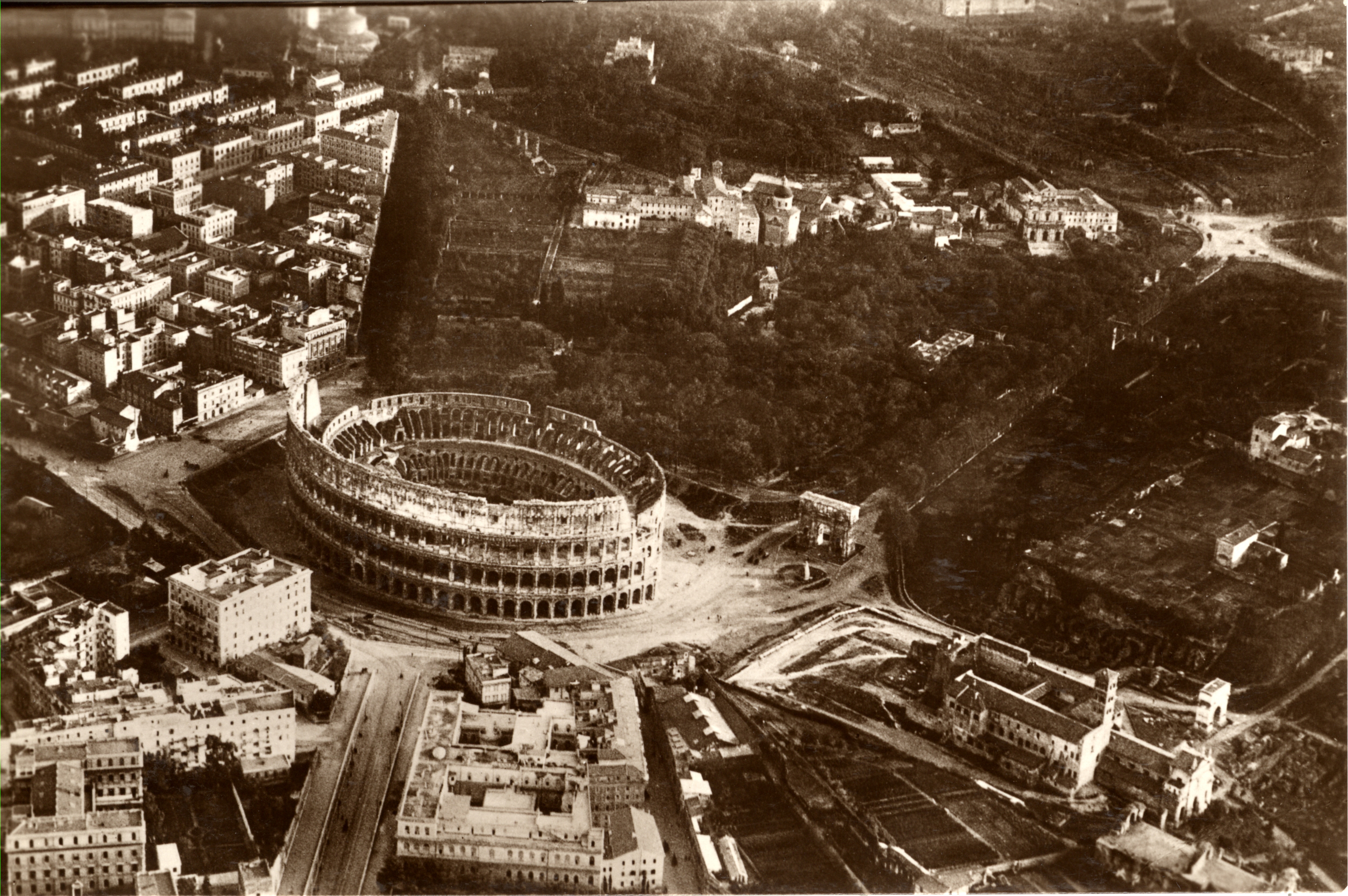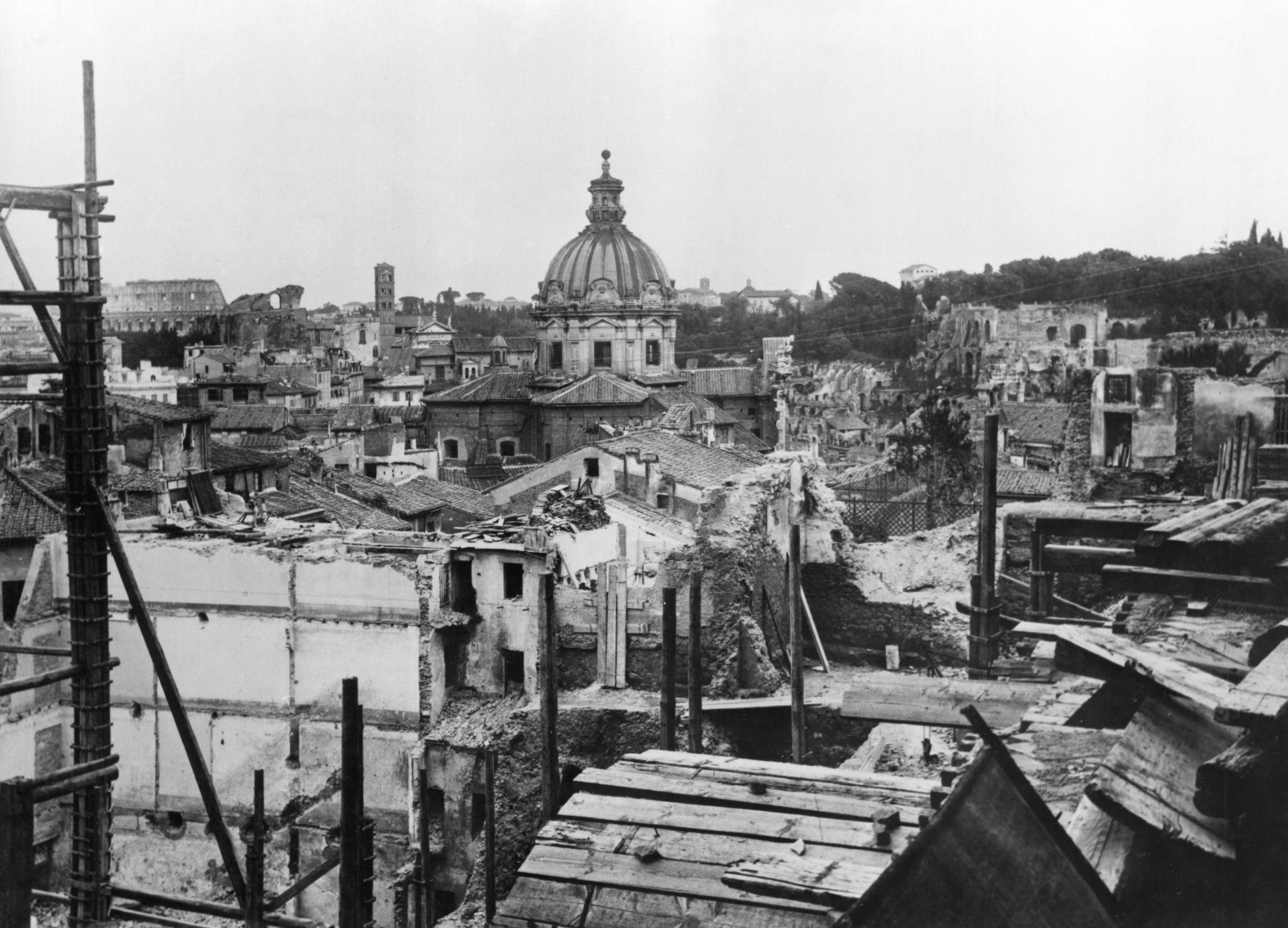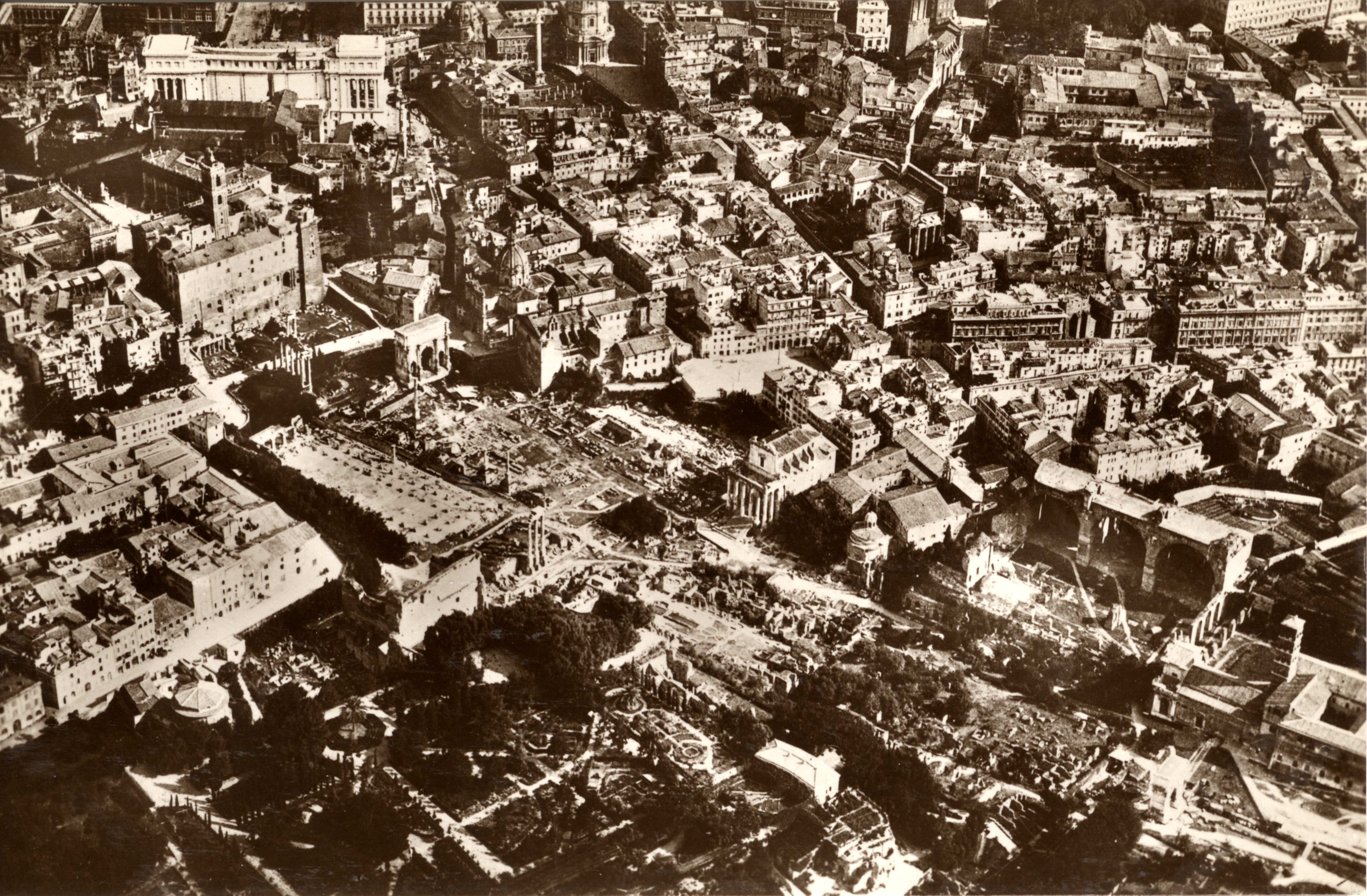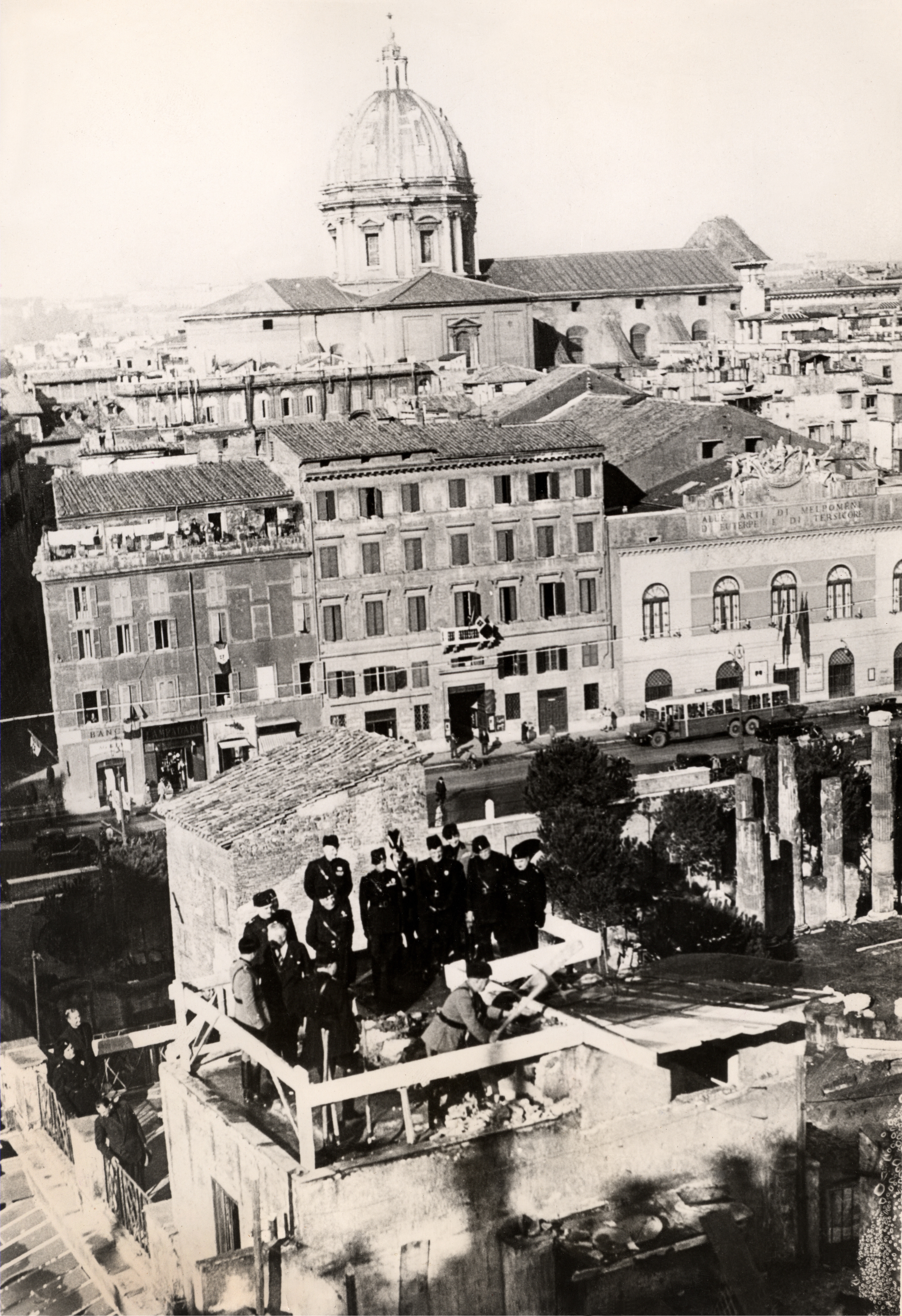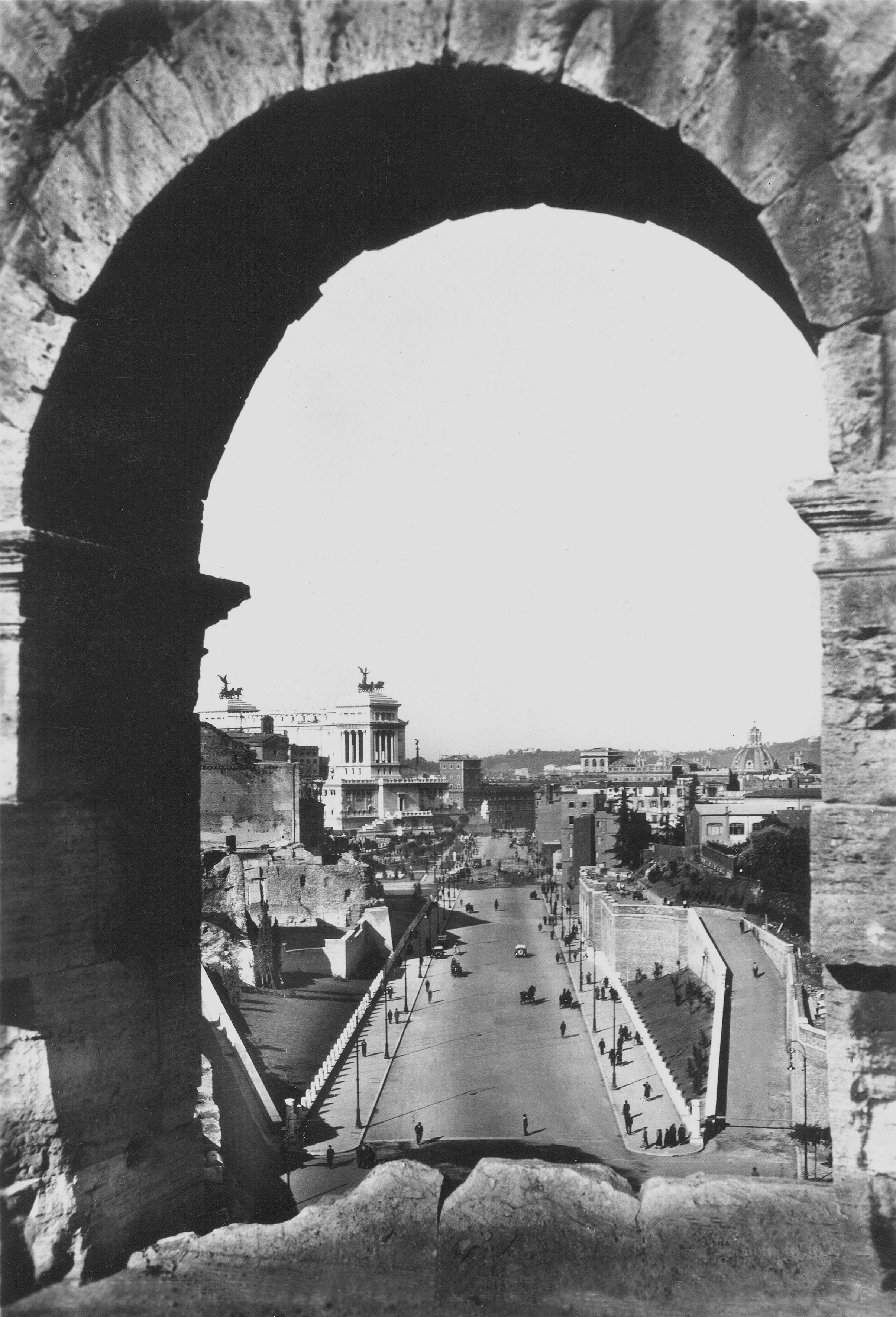 Nel 1925 l’applicazione delle leggi fascistissime consacra il successo definitivo del Regime. Il Duce vuole celebrare la grandezza della capitale del fascismo e avvia una delle più grandi opere urbanistiche della storia italiana. Da “città fredda e nemica”, nelle intenzioni di Mussolini, Roma deve diventare l’erede adeguata della grande città che era ai tempi dei romani. Il progetto è coordinato da Antonio Munoz, al vertice dell’Ufficio Antichità e Belle Arti del Governatorato. Il compito affidatogli è quello di liberare la città dagli elementi tipici dello stile medievale e barocco, così da fare emergere ed esaltare con scavi archeologici “i monumenti millenari della nostra storia che debbono giganteggiare nella necessaria solitudine”, come dichiara il Duce in un discorso del 1924 sul profilo della nuova Roma. Punto di partenza di questo ambizioso progetto è la demolizione nel 1925 delle case del Centro storico, inaugurata dal Duce con tanto di piccone alla mano.