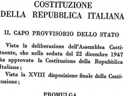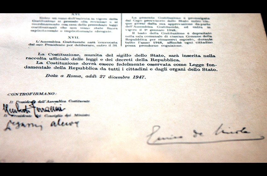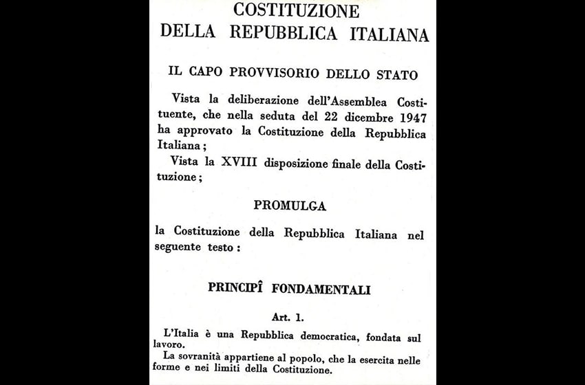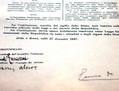 Il 1 gennaio 1948 entra in vigore la Costituzione italiana. In 139 articoli sono definiti i principi e la struttura della forma di governo repubblicana che gli italiani hanno preferito alla monarchia. Approvata il 22 dicembre 1947 con 453 sì e 62 no, la carta costituzionale era stata firmata cinque giorni più tardi dal capo provvisorio dello Stato Enrico de Nicola.