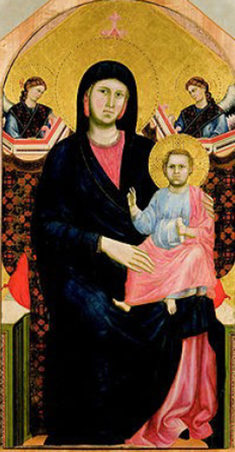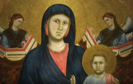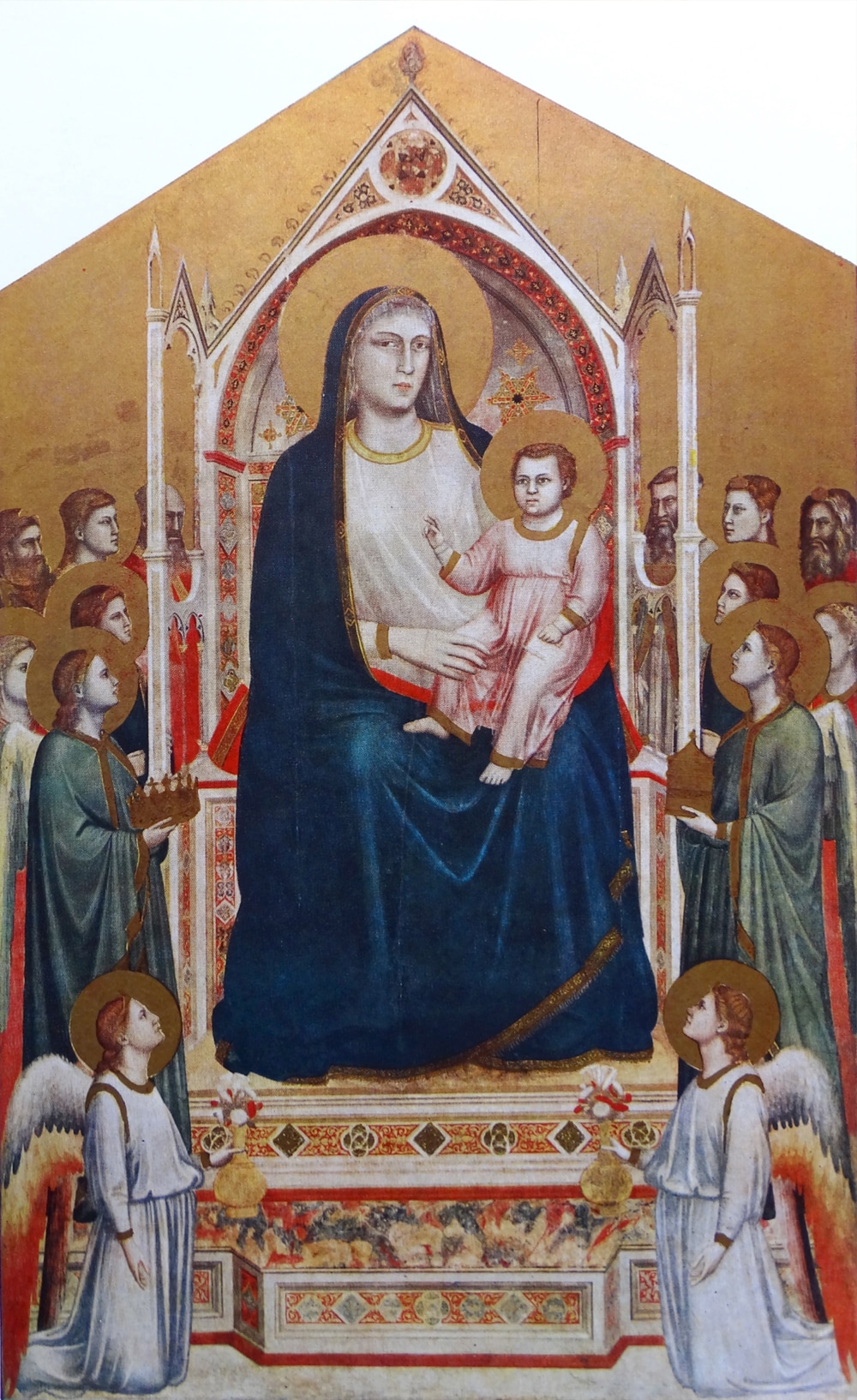 Le Madonne di Giotto affiancano le grandi Maestà di fine Duecento, che in Italia e soprattutto in Toscana, celebrano il culto mariano. Nel clima spirituale di Firenze, prolificavano numerose: note quelle di Cimabue per Santa Trinità (1280) e Duccio di Buoninsegna per Santa Maria Novella (1285). L'iconografia di origine cristiana della Vergine Odigitria, diffusa nell'arte bizantina e poi nel medioevo, presenta la Madonna con Bambino che, seduto sul ginocchio sinistro, con una mano benedice, con l'altra stringe un rotolo simbolo di sapienza. Il giovane Giotto alle prese con un tema importante, lo trasforma nell’intimo e già nella sua prima Maestà della Pieve di Borgo San Lorenzo (1290), tavola che doveva essere di notevole dimensioni, emerge familiare l'affettuosa carezza del Bambino, un naturalismo che preannuncia la Madonna di San Giorgio alla Costa (1295). Quest'ultima, pure mutilata nelle sue originarie dimensioni, ha tutte le caratteristiche del giovane Giotto: la plasticità delle figure e una straordinaria raffinatezza cromatica. Incerta la data per la Maestà di Ognissanti, tavola dipinta dal maestro per la chiesa omonima, o dopo il ritorno a Firenze da Assisi (1300-1305), o dopo il 1310, come suggerito dal video girato in occasione del restauro. Con quest’opera, Giotto ha raggiunto grande notorietà, è un pittore ricco e richiesto, capace di modellare nell'oro volumi di luci e ombre, velature di trasparenze, spazialità vere e nello stesso tempo, dettagli preziosi e decorazioni a cui guarderanno i pittori gotici. Nei primi anni del Trecento, Giotto ha umanizzato il sacro, ha avvicinato il divino all’uomo, ha istituito una comunicazione con i fedeli del popolo.