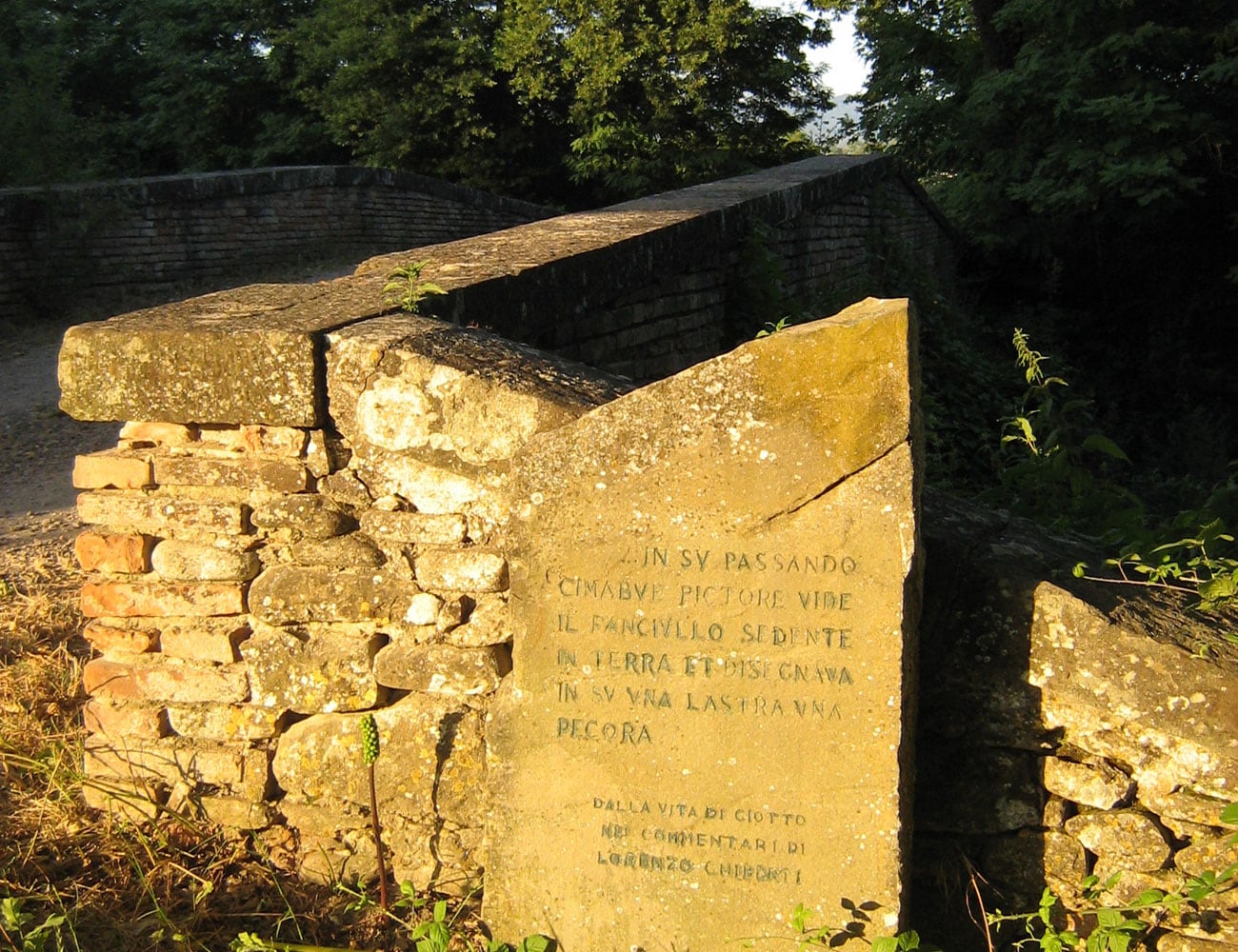 ".... in su passando Cimabue pictore per la strada a Bologna, vide el fanciullo sedente in terra et disegnava su una lastra una pecora ...." Percorrendo la statale 551, non lontano da Vespignano, a fondovalle, l'elegante ponte cinquecentesco, che sostituisce quello medioevale sul torrente Ensa, secondo leggenda sarebbe stato il famoso luogo di incontro tra Cimabue e Giotto fanciullo, intento a disegnare una pecora su una pietra. Il maestro fiorentino, colpito dal prodigioso pastorello, l'avrebbe condotto nella sua bottega a Firenze.