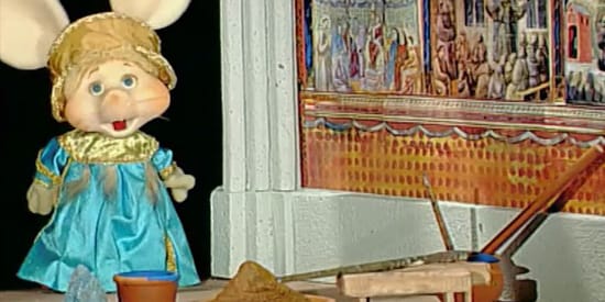 Sos, opera d'arte chiama, rubrica con il personaggio di Topo Gigio qui accompagnato da Vito, andava in onda la domenica alle nove su Rai Uno, nel programma La banda dello Zecchino. Il mitico pupazzo di Maria Perego, animato dalla vocina di Peppino Mazzullo, veste i panni fiabeschi di un Giotto, alle prese con il cerchio, Cimabue e le pecorelle, nonché una moglie e otto figli.