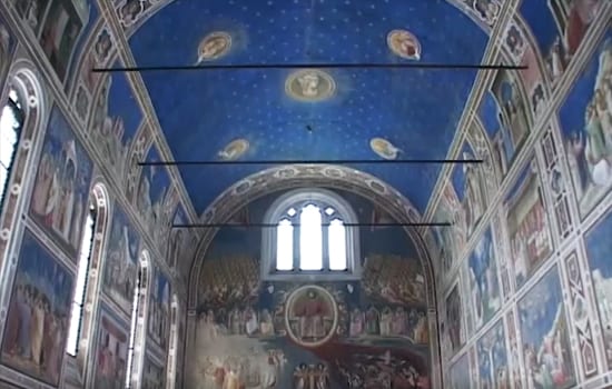 Un racconto appassionato sul capolavoro padovano di Giotto, la Cappella degli Scrovegni dipinta fra il 1303 e il 1305, per volontà del facoltoso signore di Padova, Enrico Scrovegni. La presenza dell’artista a Padova, accertata anche per la Basilica di Sant’Antonio e per il Palazzo Comunale, attesta il prestigio di Giotto chiamato a decorare in una città ricca ed in grande espansione. A fine Duecento Padova contava più di 30.000 abitanti sparsi in comuni, principati ecclesiastici e soggetti politici garanzia di fedeltà al papato. Il ciclo delle Storie della Vergine e Gesù, ispirate da un teologo agostiniano, si sviluppa sulla pareti; nella parte bassa, dentro dei monocromi, le allegorie dei Vizi e delle Virtù. A concludere idealmente le Storie, l'intera parete di fondo che mostra un grande Giudizio Universale e in alto, una volta di stelle brillanti in un blu intenso di fortissimo impatto visivo. Degni di nota, due riquadri situati nell’arco trionfale della Cappella: dentro uno spazio senza figure, Giotto dipinge un’architettura, una volta a crociera da cui pende un lampadario metallico e poco oltre, una bifora che mostra un vero cielo azzurro di atmosfera. Per la prima volta nella pittura occidentale un trompe-l'œil, meglio, due “inganni ottici”, come scrisse lo storico dell'arte Roberto Longhi nel suo Giotto spazioso (1952).