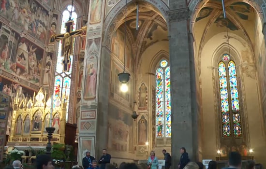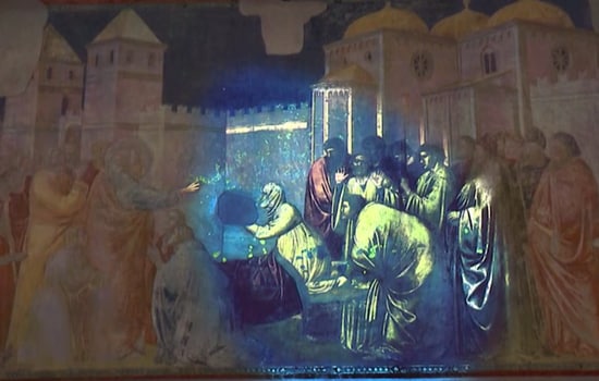 La Cappella Peruzzi, adiacente l’altare maggiore di Santa Croce, fu affrescata da Giotto intorno al 1318-1322, con le storie dei Santi Giovanni Evangelista e Battista. Eseguite con la tecnica a secco su muro, spesso si è scritto che Giotto optasse per questo metodo più veloce, ma meno duraturo, perché troppo impegnato in altri cantieri. Gli ultimi studi invece, propendono per una vera e propria scelta artistica, volta all’ottenimento di effetti pittorici più simili a quelli della pittura gotica su tavola, come il brillare di ori e argenti, o gli effetti sfumati di alcuni paesaggi. Il breve filmato proposto, mostra le nuove indagini diagnostiche condotte dall’Opificio delle Pietre Dure, co-finanziate da Getty Foundation con l’Opera di Santa Croce. Attraverso il chiaroscuro che torna evidente alle lampade a raggi UV, emergono volumi importanti che conferiscono alle figure presenza realistica nello spazio tridimensionale. I panneggi, i decori sontuosi delle vesti, i preziosi particolari di architetture, gli oggetti cerimoniali e decorativi, i volti che tornano leggibili, sono alcune delle meraviglie dell’arte giottesca rinvenute agli occhi di ricercatori e restauratori. Un altro breve contributo video, è dedicato alla mostra allestita a Palazzo Reale di Milano, Giotto, l'Italia. Da Assisi a Milano, dove un'installazione video permetteva la visita virtuale della cappella Peruzzi.