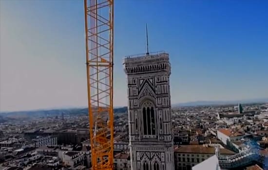 Samuele Caciagli, architetto dell’Opera del Duomo, racconta il restauro del Campanile avviato dopo due anni e più di indagini. I lavori fanno parte di un progetto di restauro della struttura lignea di copertura del monumento e si inscrivono su un programma di manutenzione del Duomo di Firenze che permetterà di individuare possibili futuri degradi. Le immagini spettacolari sulla gigantesca gru con un braccio di 135 metri, mostrano gli operai dell’Opera calati dall’alto per controllare un pennone di 14 metri, un’asta di cipresso rosso, sopra la quale una sfera dorata contiene le reliquie della Santa Croce e il bastone di San Giuseppe.