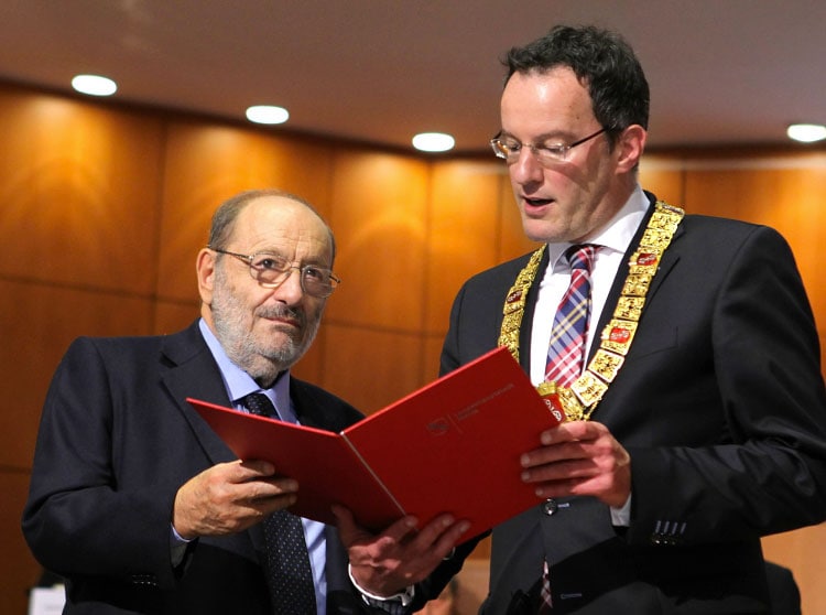 10 giugno 2015: Umberto Eco riceve la laurea honoris causa in Comunicazione e Cultura dei media a Torino dal rettore Gianmaria Ajani con la seguente motivazione: ha arricchito la cultura italiana e internazionale nei campi della filosofia, dell’analisi della società contemporanea e della letteratura, ha rinnovato profondamente lo studio della comunicazione e della semiotica. In quest’occasione Eco si sofferma sui social network e sulla violenza verbale che questi mezzi scatenano.